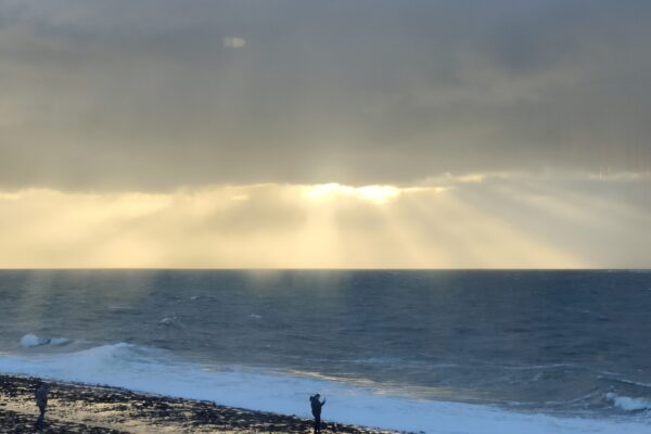 Um ca. 02.00 Uhr, mitten in der Nacht, bin ich aufgewacht und hatte eine Meldung der Polarlichtvorhersage auf dem Handy. Die Wahrscheinlichkeit Polarlichter zu sehen steigt von Minute zu Minute. Ich gehe regelmässig aus dem Bett um zu schauen. Leider ist es bewölkt und somit besteht keine Chance das Polarlicht zu sehen. Gegen 03.00 Uhr gibt es Lücken in der Wolkendecke. Der Vorhersagewert steigt über 8. Dies ist ein ziemlich hoher Wert. Rundum kommen Meldungen von Sichtungen rein. Ich kann nicht mehr schlafen und beschliesse zum Strand zu fahren. André kommt auch mit. Vielschichtig angezogen und mit Decken bewaffnet, fahren…