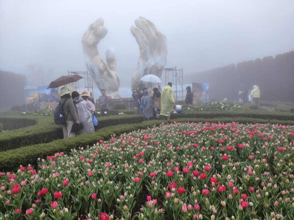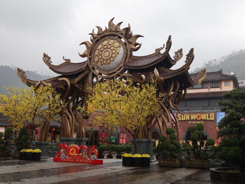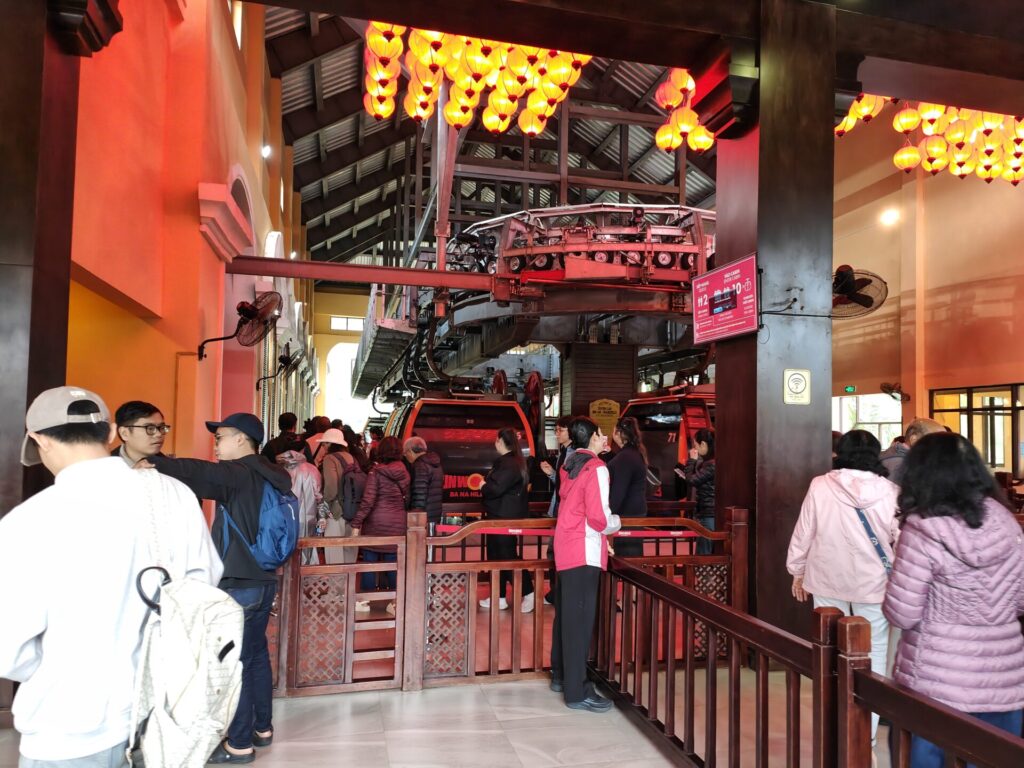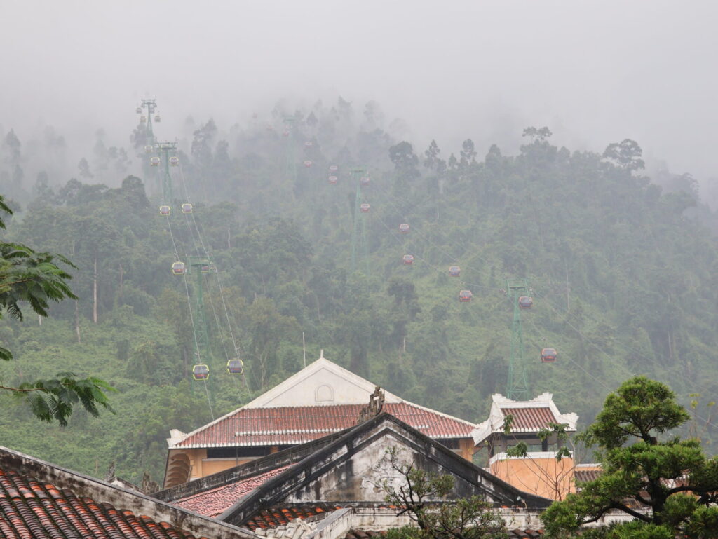 Nach eine knappe Stunde fahren sind wir in Ba Na angekommen. Es geht mit der Kabelbahn hoch. Wir fühlen uns wie zuhause. Wir sind mitten in den Wolken und sehen nichts. Auch oben an Ba Na Hills ist die Sicht sehr schlecht.