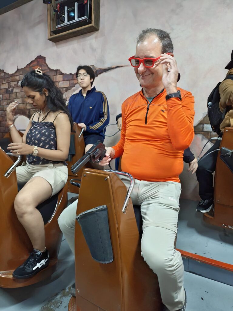 Zuerst geht es in einem 5D Kino. Dort sitzen wir auf Pferden Atrappen. Mit einem 3D Brille und einer Pistole geht es zum wilden Westen. Wir versuchen die Banditen abzuschiessen. Eigentlich ganz lustig, aber gar nicht so einfach. André hat 10’000 Punkte, ich 11’000. Der Gewinner hat 20’000 Punkte erreicht.