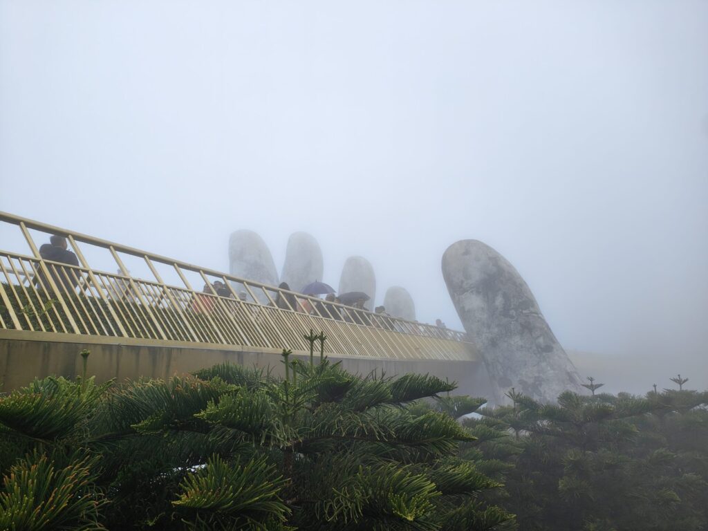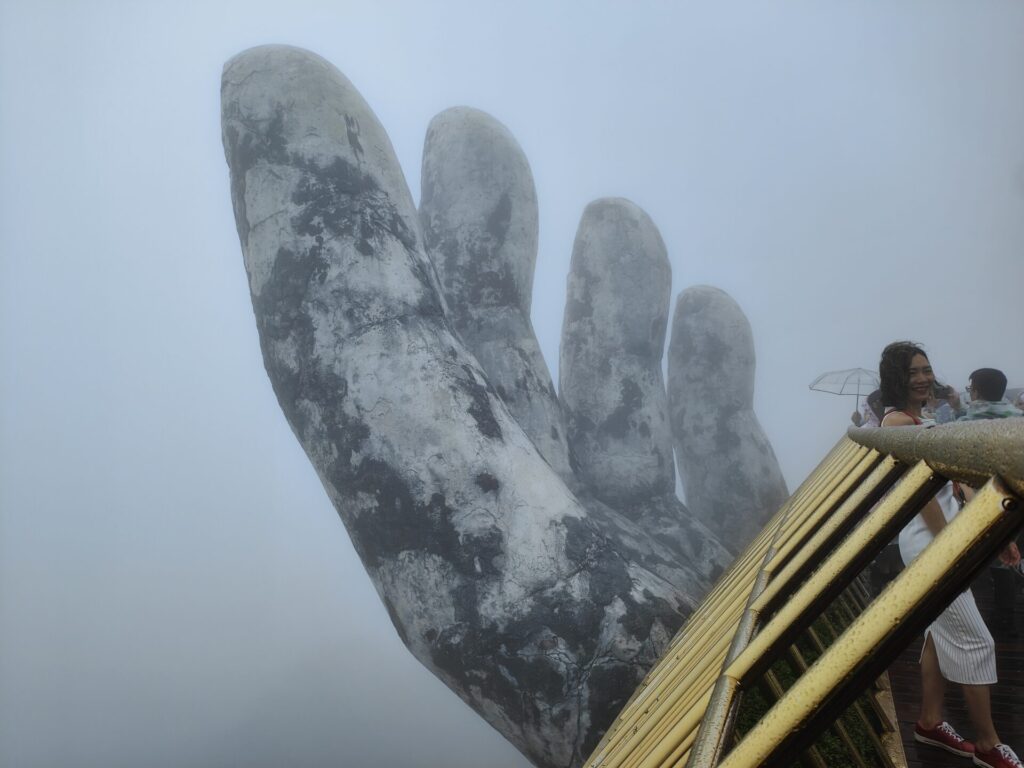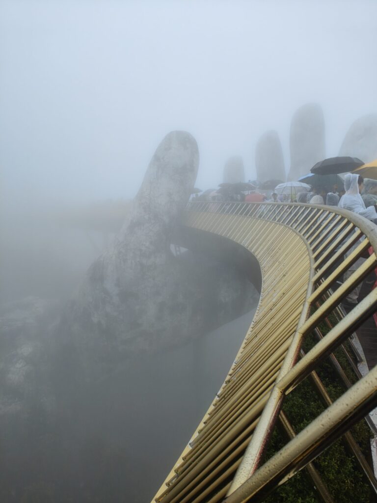 Als eerste bezoeken we de Gouden Brug. Deze brug wordt gedragen door twee handen en is goudkleurig, zoals de naam al doet vermoeden. Het lijkt wel alsof er nog duizend anderen op de brug staan.