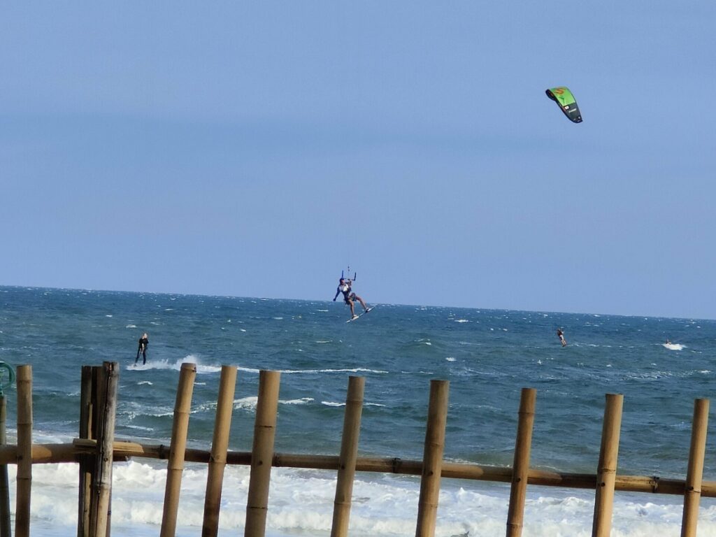 Heute war perfektes Kitesurf Wetter. Die Sonne scheint und es bläst ein starker Wind (etwa 20 – 25 km/h). Voller Tatendrang gehen wir zum Strand. Wir werden eingekleidet, T-Shirt, Harnas und Helm. Dann geht es für mich direkt ins Wasser, André übt noch auf dem Strand.