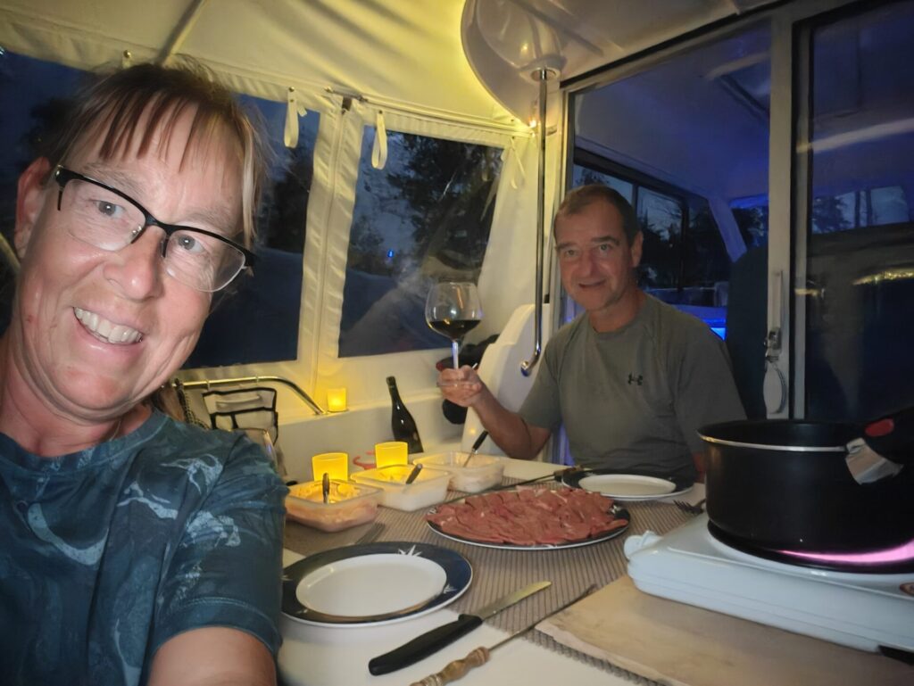 ’s Avonds hebben de schipper en zijn vrouw waarschijnlijk hun laatste fondue chinoise gegeten dit seizoen. Ze hebben het heel gezellig gemaakt en genoten van een diner bij kaarslicht.