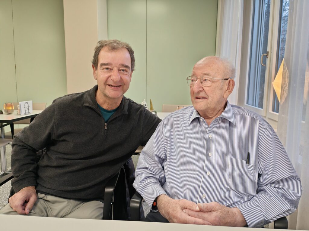 We hebben Claude uit zijn middagslaapje gewekt. Het duurt vrij lang voordat hij de telefoon opneemt. Als we aankomen, is hij al behoorlijk wakker. Samen gaan we koffie drinken in het restaurant. Ook in Winterthur is het mistig. Grijs in grijs 🥲.