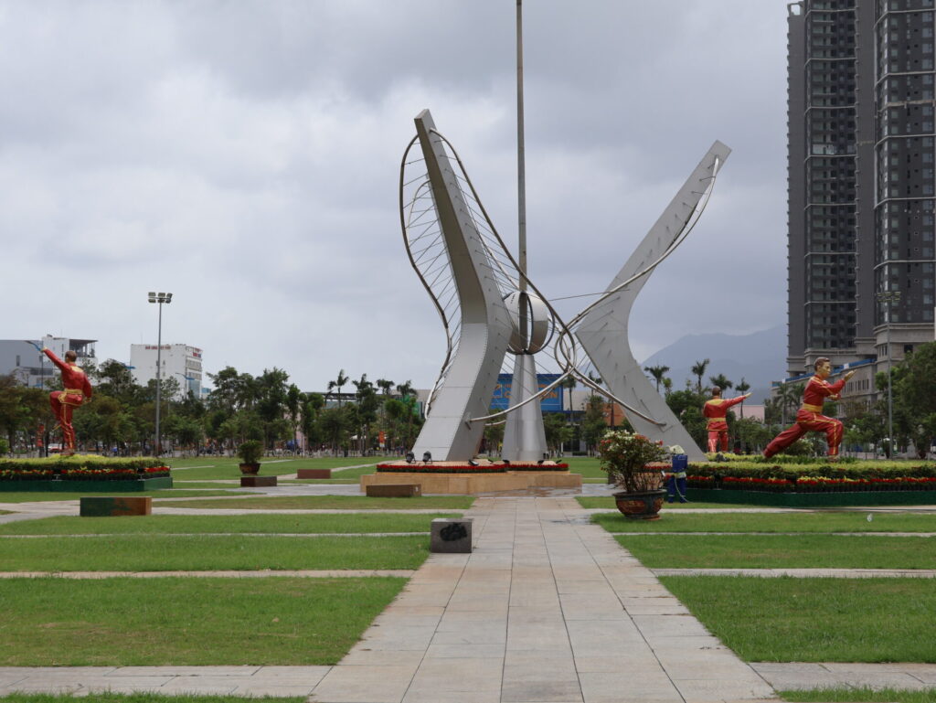 Danach ging es zum ehemaligen militär Flughafen. Auf Google Maps ist die Struktur eines Flughafens gut zu sehen. Auf dem Gelände erinnert nur ein Denkmal daran. Jetzt haben sich alle namhaften Banken (Vietcombank, Vietinbank, Vietnam Post, BIDV, etc) hier niedergelassen. Der Platz bekam von uns daher der Namen Vietnamesischer Paradeplatz.