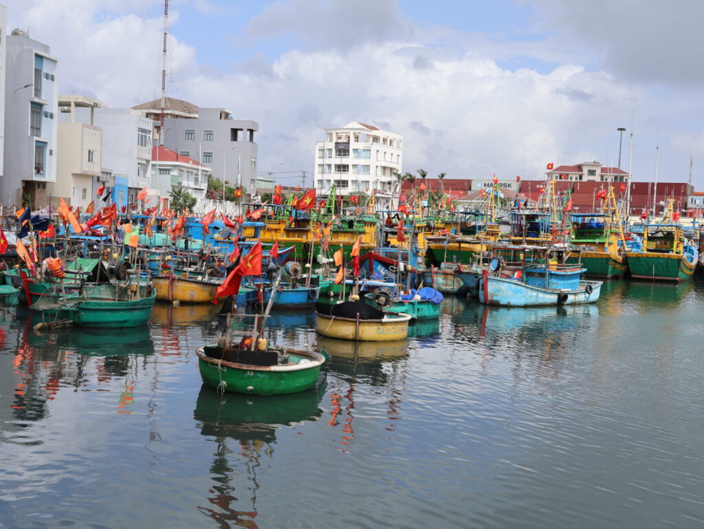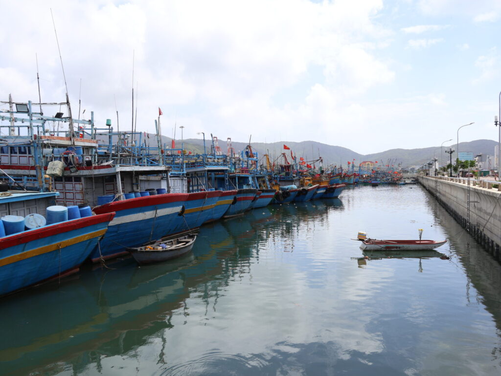 We zijn naar het havengebied gelopen. Quy Nhon heeft een grote haven met kranen en een enorme vissersvloot. Maar ook dit gebied is uitgestorven. Alleen een groter restaurant in de jachthaven Tocepo is open.