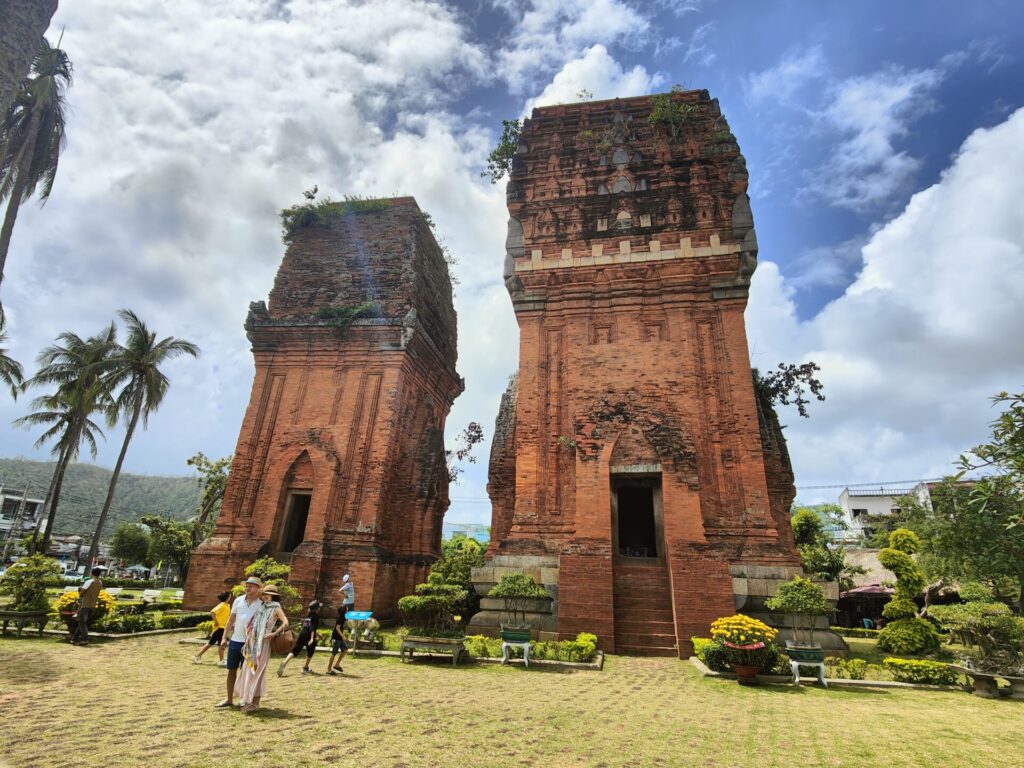 We gaan verder naar de twee torens (tweelingtorens) Tháp Đôi Quy Nhơn. Ze behoren tot het best bewaarde architecturale erfgoed van het oude Champa-koninkrijk. Deze twee torens dateren uit het einde van de 12e eeuw. Ze zijn uniek omdat ze invloeden van de Khmer-architectuur (vergelijkbaar met Angkor Wat of My Son) vertonen. De noordelijke toren is ongeveer 20 meter hoog, de zuidelijke toren 18 meter. Ze zien er echter niet uit als tweelingtorens. Vooral de sokkel is behoorlijk verschillend. Buiten Quy Nhon zijn er nog meer van dergelijke torens. Misschien lukt het ons om ze met de scooter te bezoeken.