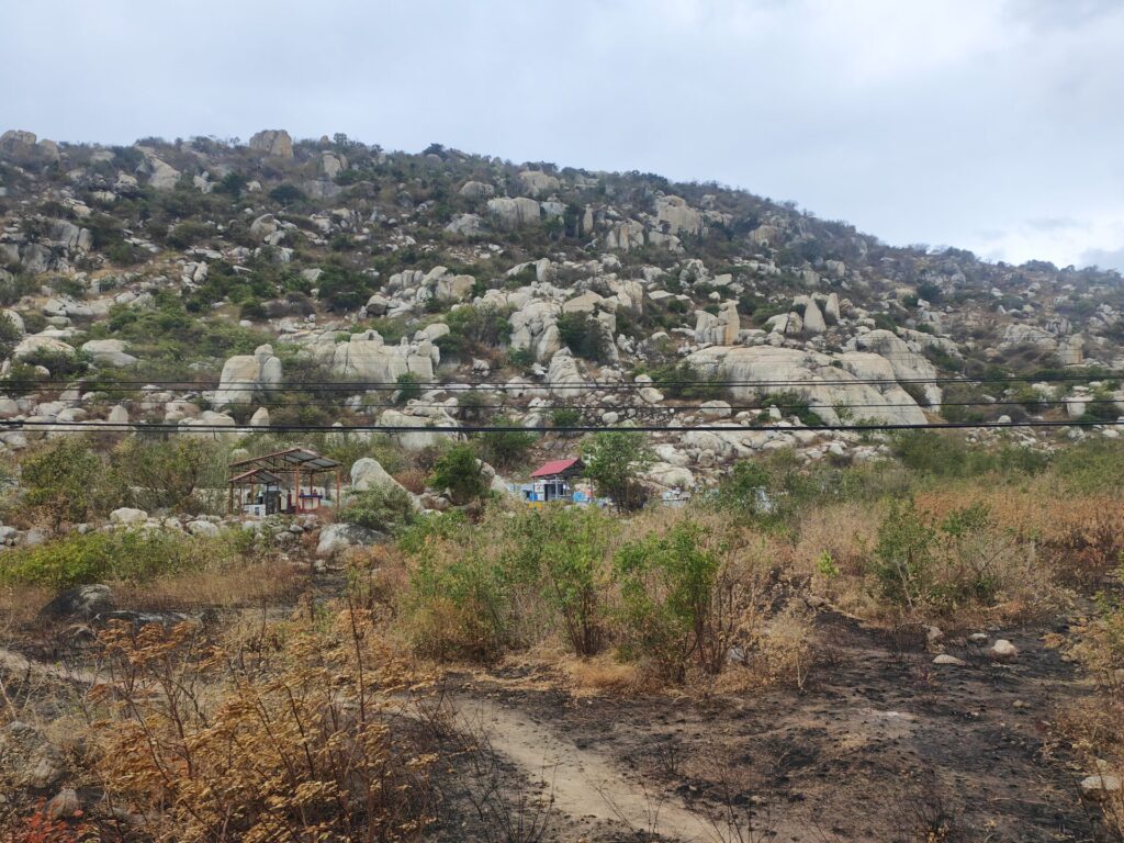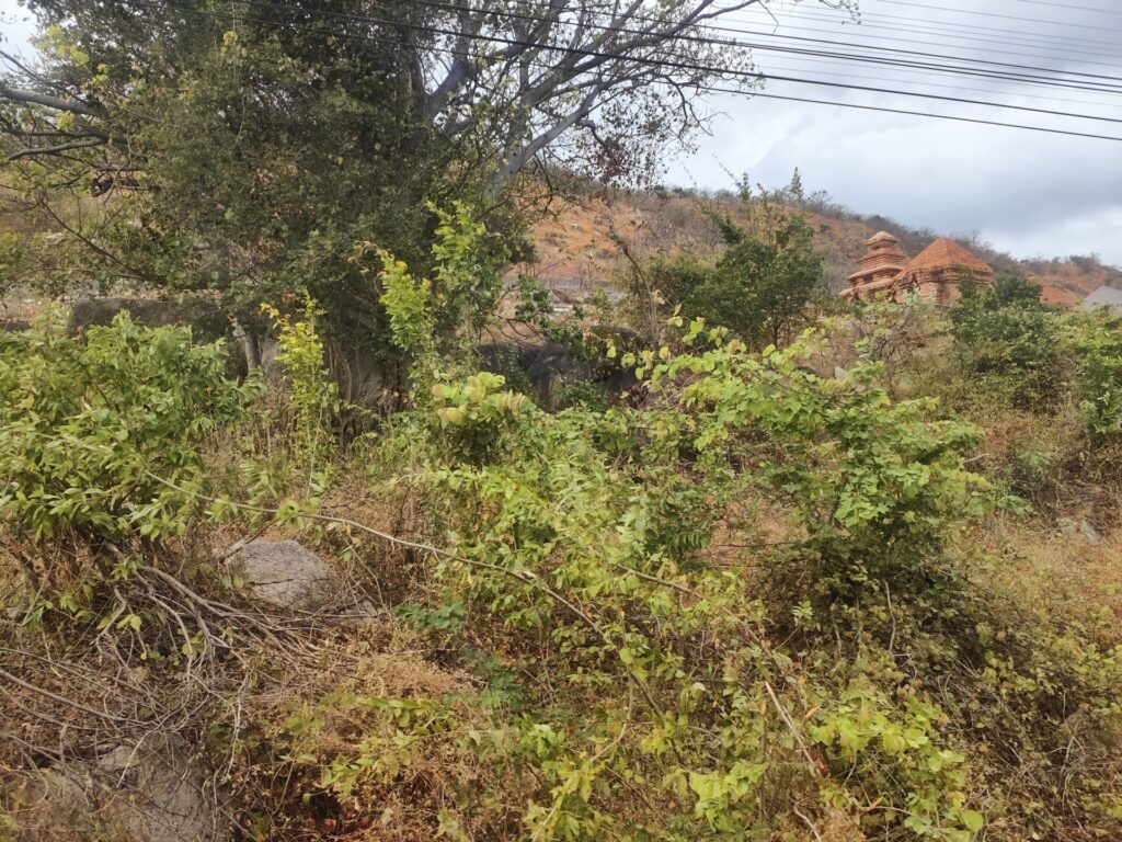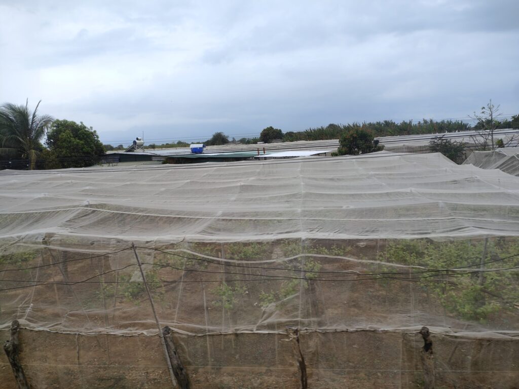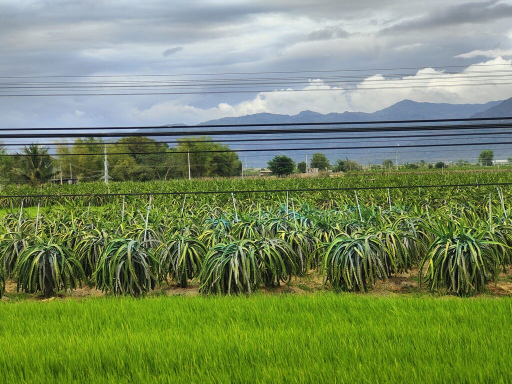Hier in de omgeving worden ontzettend veel drakenvruchten geteeld. Sommige plantages zijn leeg, dan zijn er plantages waar de planten bloeien en op weer andere plantages hangen de rode vruchten klaar om geoogst te worden. En dat allemaal door elkaar heen. Hoe ze dat doen, geen idee.