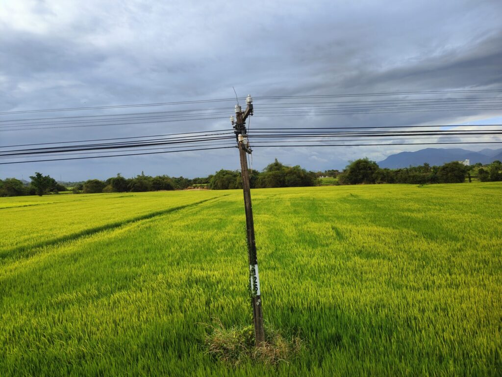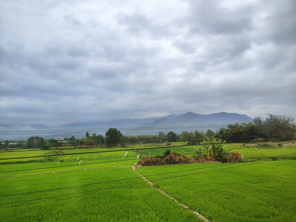 Die Reisfelder werden bereits ein wenig gelber. Sattgrüne Felder haben wir fast nicht gesehen. Es wird viel Eukalyptus angebaut. Leider sehen diese Bäumen nicht sehr gesund aus.