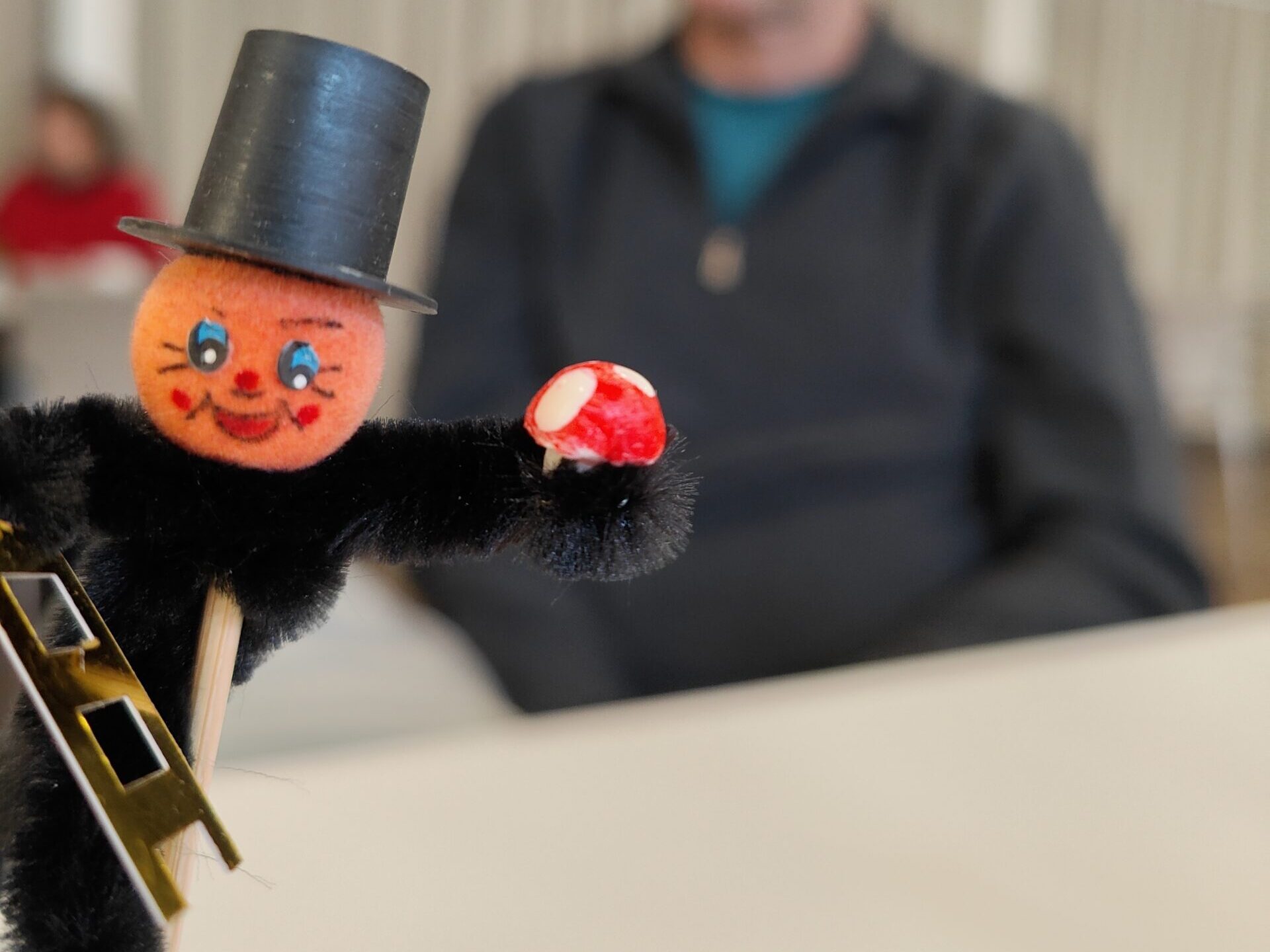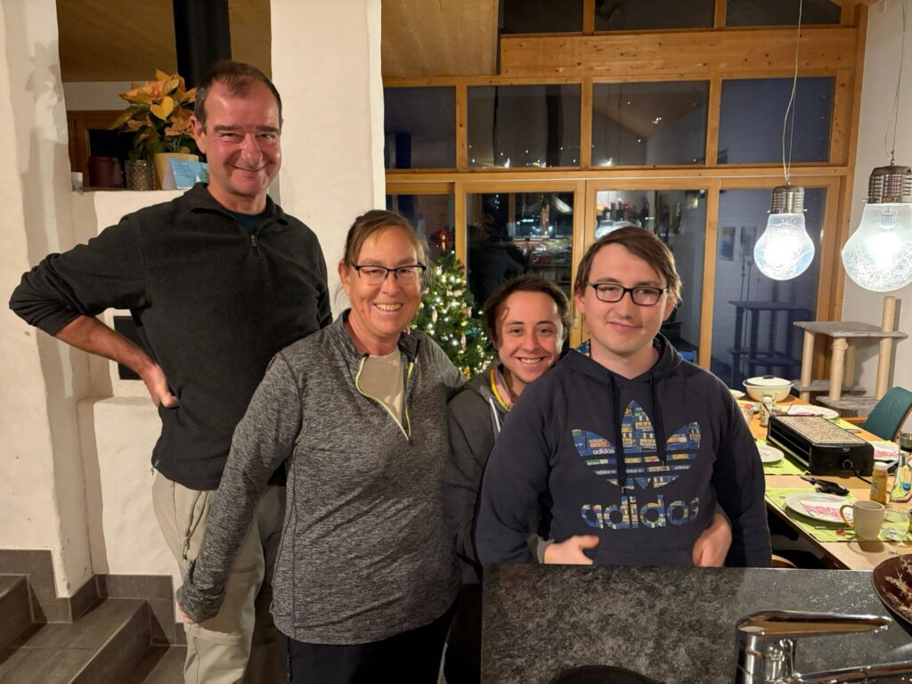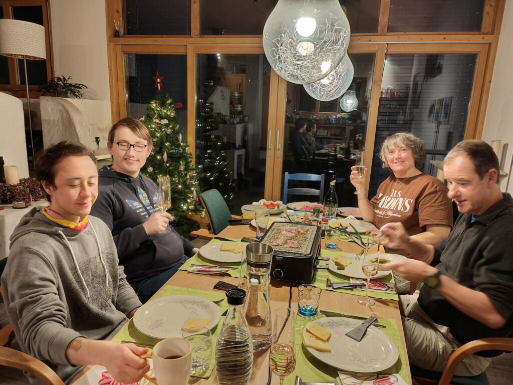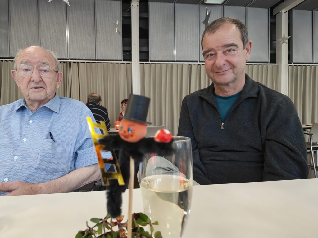 Wir holen Claude ins Zimmer ab und gehen ins Restaurant. Dort stossen wir mit einem Prosecco aufs 2026 an. Die Weihnachtsdekoration ist verschwunden und hat Platz gemacht für den Kaminfeger. Ein Glücksbringer für das neue Jahr.
