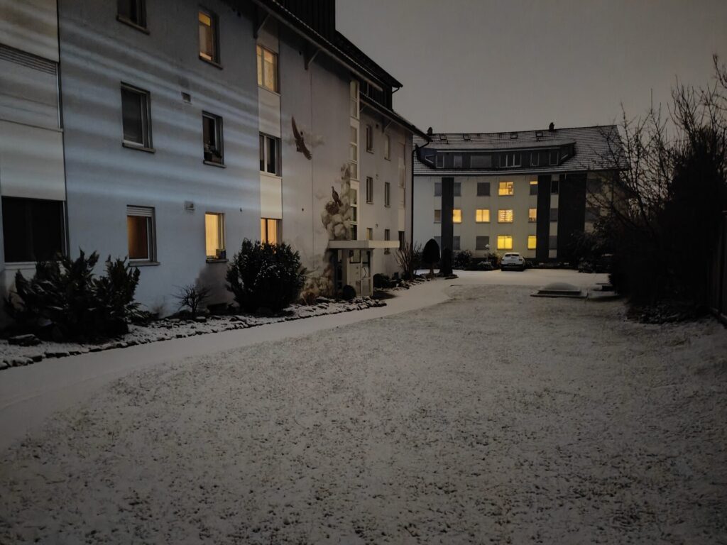 Auf dem Rückweg nach Weinfelden, hat es angefangen zu schneien. In Weinfelden war eine geschlossene Schneedecke auf der Strasse. Der Schnee hat bei jedem Schritt unter die Schuhen geknirscht. Einfach nur herrlich.