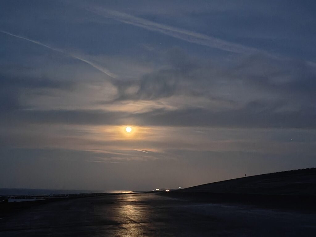 Auf dem Rückweg haben wir am Autostrand angehalten. Eigentlich wollten wir die beleuchteten Windräder von den Offshore Windparks zeigen. Leider konnten wir sie nicht sehen. Dafür aber den noch fast Vollmond.