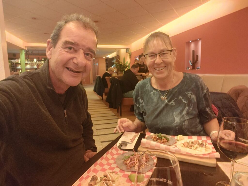 Vandaag was het tacodag. Er was een menu met zes verschillende taco’s en een dessert. Dat moesten we natuurlijk proberen. De taco’s waren heerlijk. Er waren vegetarische taco’s met zoete aardappelen, taco’s met vis en vlees. Behoorlijk gevarieerd. De bediening was erg attent en vroeg ons steeds hoe het smaakte. Omdat het de eerste keer was dat er een thema-avond werd georganiseerd, was ze benieuwd hoe het werd aangenomen en of het genoeg was. We gaan zeker nog eens terug om de gewone kaart te proberen.
