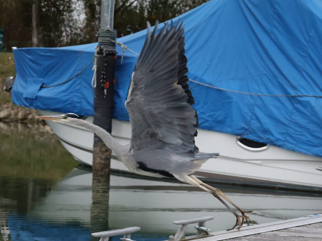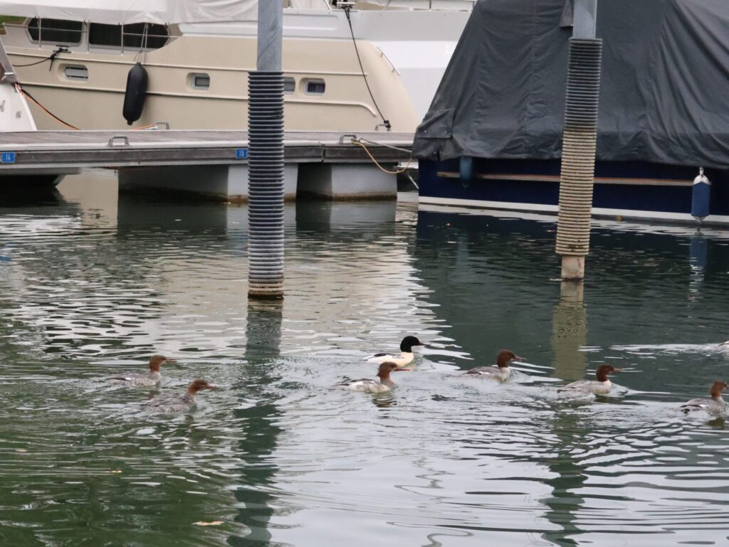 Bei mir am Steg wird es immer ruhiger. Auch der direkte Nachbarn ging heute nach Romanshorn zum Auswassern. Der Vorteil, der Skipper und seine Frau haben immer bessere Sicht auf die Tiere, welche den Hafen zurück erobern.