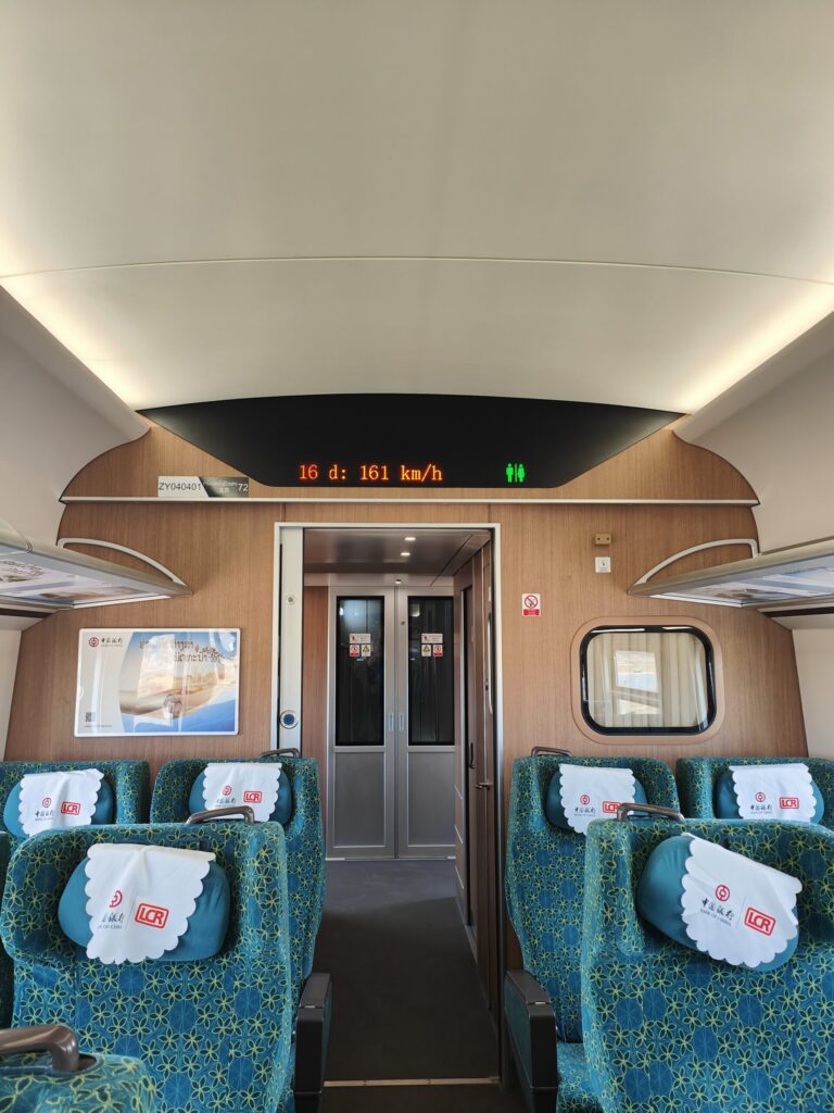 Zwanzig Minuten vor Abfahrt werden die Türen zum Gleis geöffnet. Ganz viele Leuten wollen mit und stehen schön in der Warteschlange. Wie wir auch natürlich. Es geht ganz flott und wir finden unsere Plätzen auf Anhieb. Los gehts. Es ist der Schnellzug Lancang. Mit 161 km/h reisen wir durch die Landschaft.