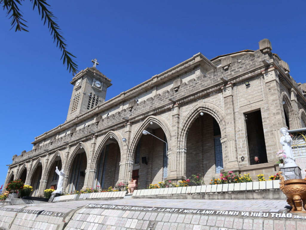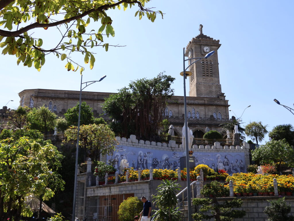 Onze laatste stop op onze rondreis was de bergkerk, ook wel de kathedraal van Nha Trang genoemd. De kerk staat op een heuvel. Hoewel het een katholieke kerk is, is ze eenvoudig ingericht. Heel ongebruikelijk voor ons.