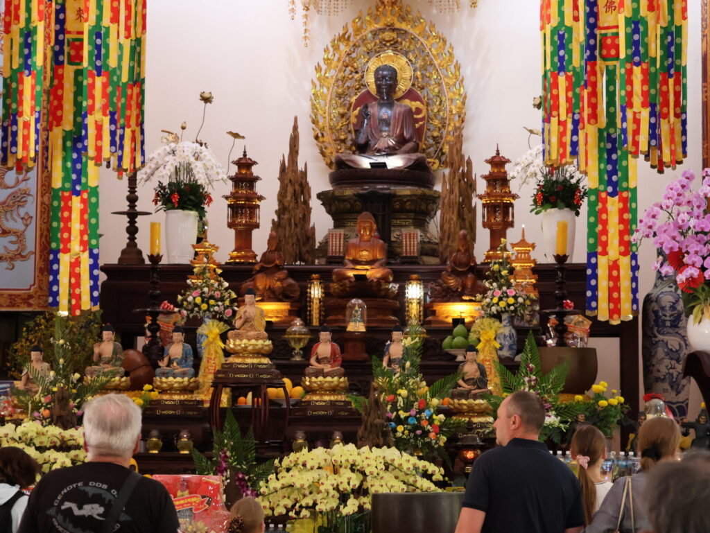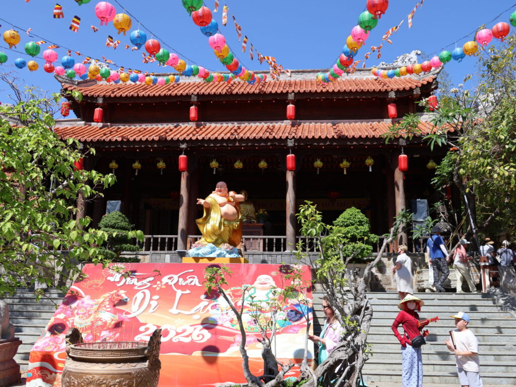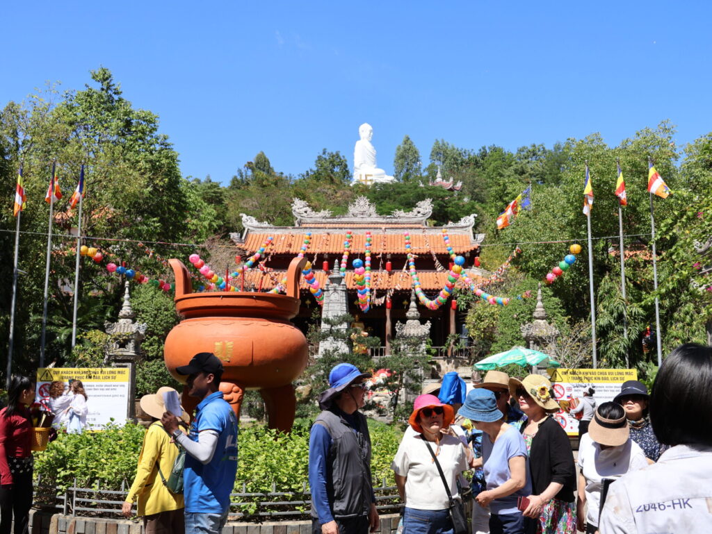 Na een lekkere verfrissing bezoeken we de Long-Sơn-pagode. De pagode werd in 1889 op de Trai Thuy-heuvel gebouwd en heette toen Dang Long-pagode. Nadat de pagode in 1900 door een storm werd verwoest, werd hij verplaatst naar de zuidelijke voet van de heuvel en omgedoopt tot Long Son-pagode. Dat is de plek waar hij nu staat.