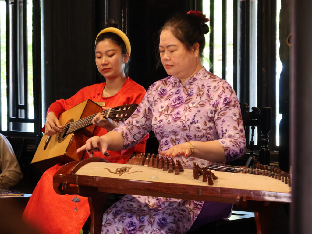 Es war Zeit für eine Erfrischung. Das Wetter ist heute sehr warm. Zum Glück können wir jeweils im Schatten auf dem Bus warten. Pause machen wir auf Champa Island. Diese Insel besteht aus verschiedene Hotels und Restaurants. Genau was wir brauchen. Auf der Terasse am Fluss Cái geniessen wir frische gekühlte Kokosnüsse.