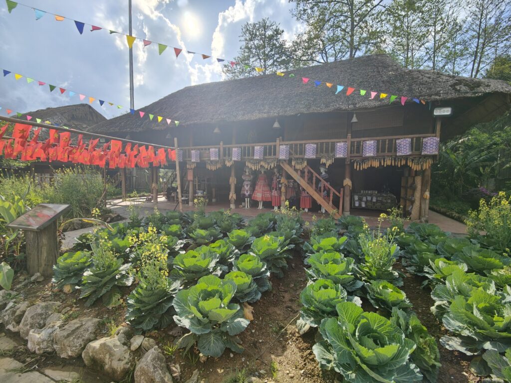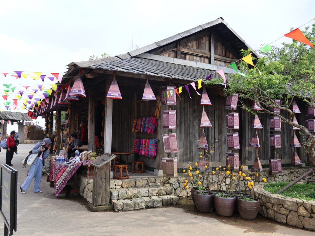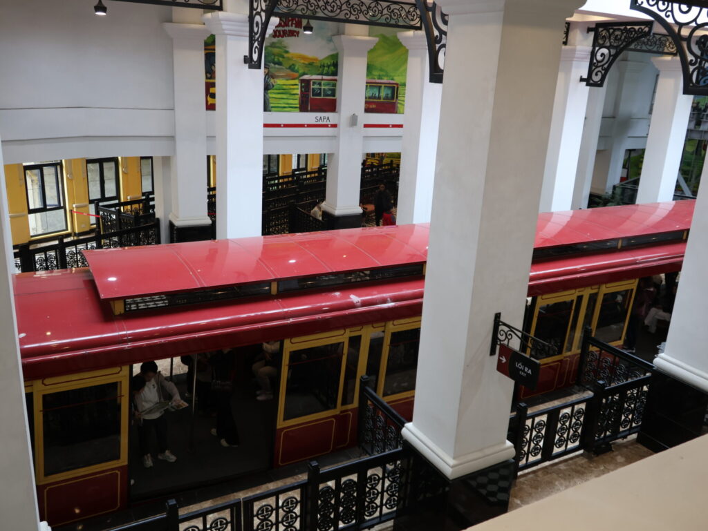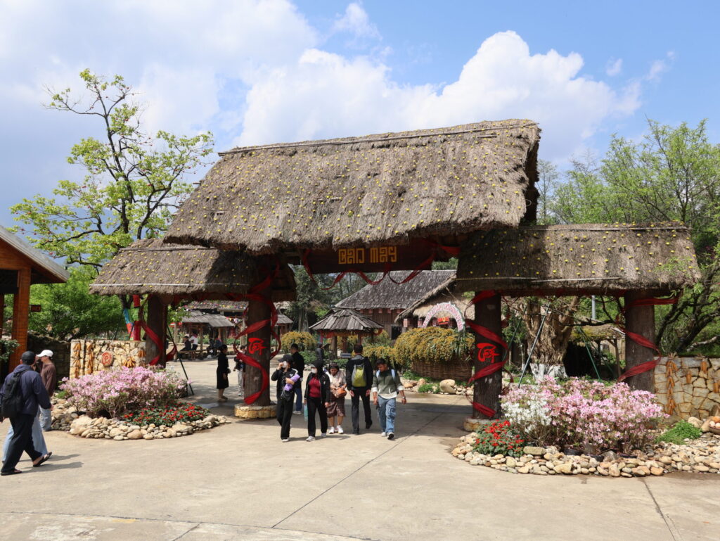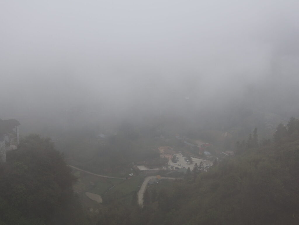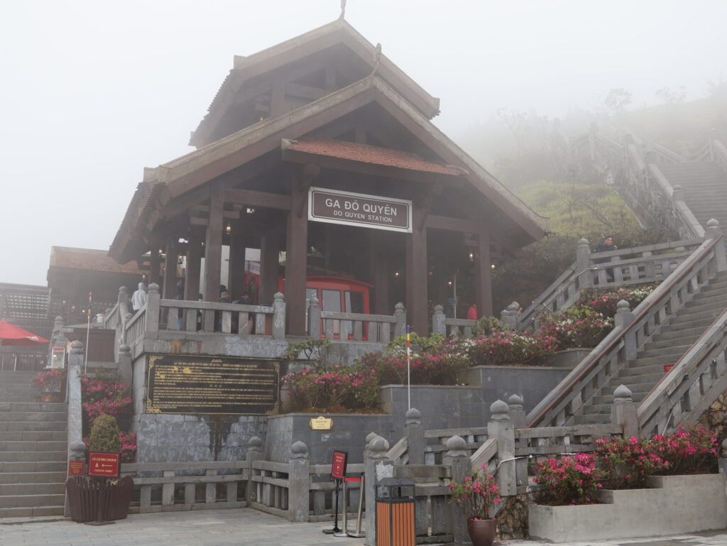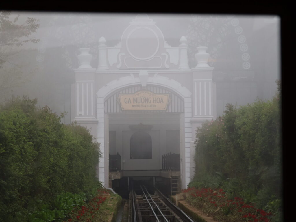 Von Sapa aus geht es mit dem Funicular, dem Muong Hoa Bahn, zur Talstation der Seilbahn. Natürlich wurde hier ein wunderschöner Park angelegt. Wir sehen leider nicht viel, da wir in den Wolken stecken. Wir müssen um den Park laufen, da wir keine Wow-Karte (VIP-Karte) haben 🙈. Wir kommen durch ein neu angelegtes Mai-Dorf. Dies ist ebenfalls einer der 54 ethischen Minderheiten in Vietnam.