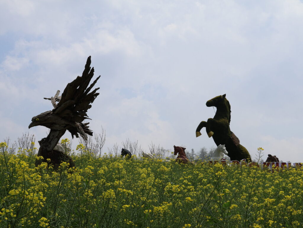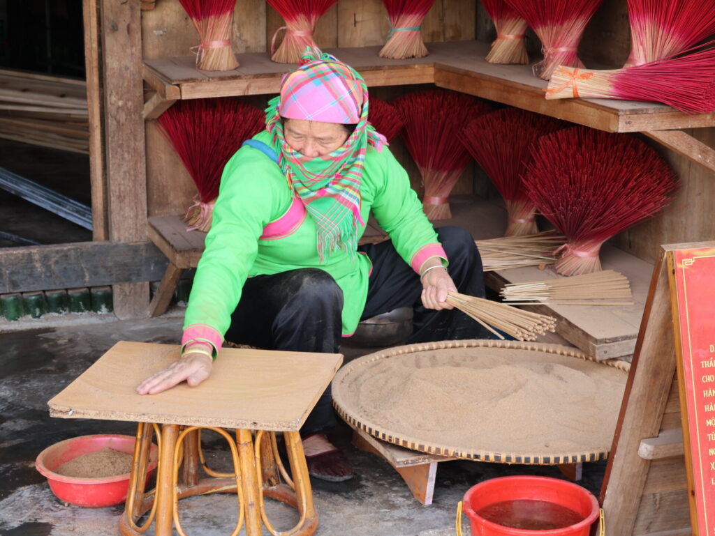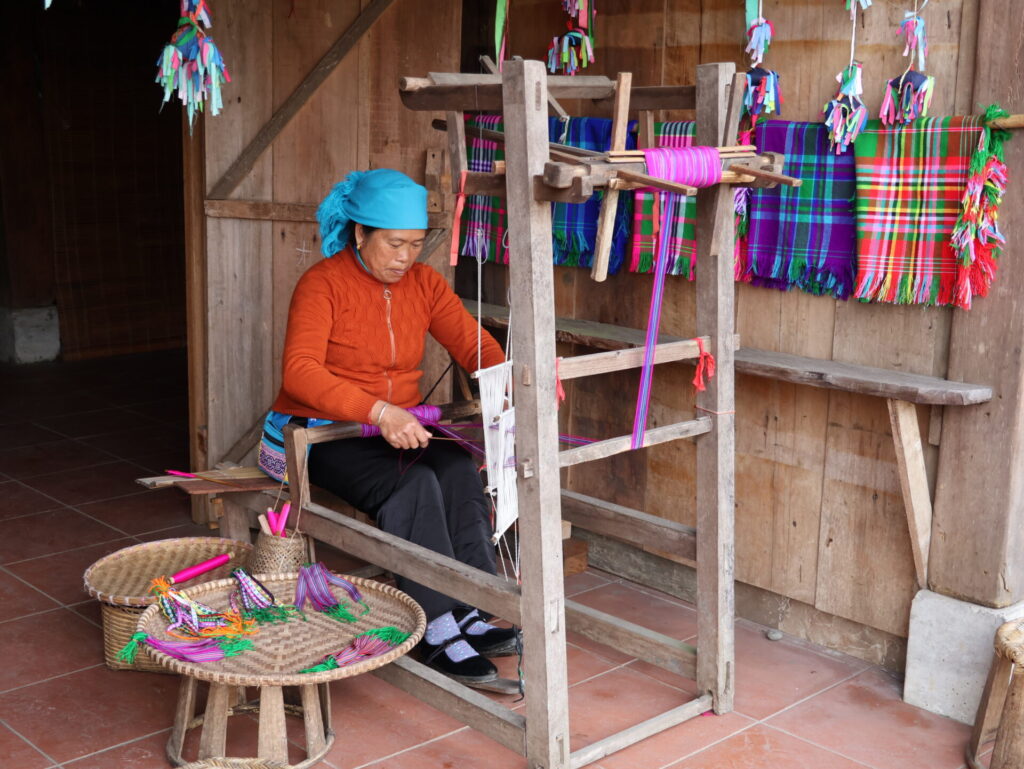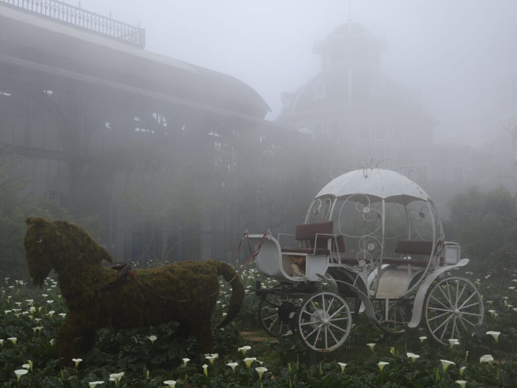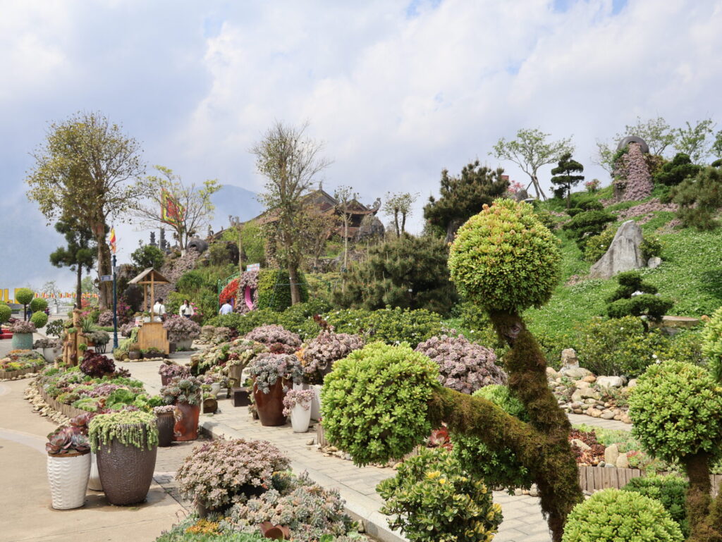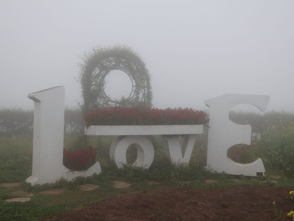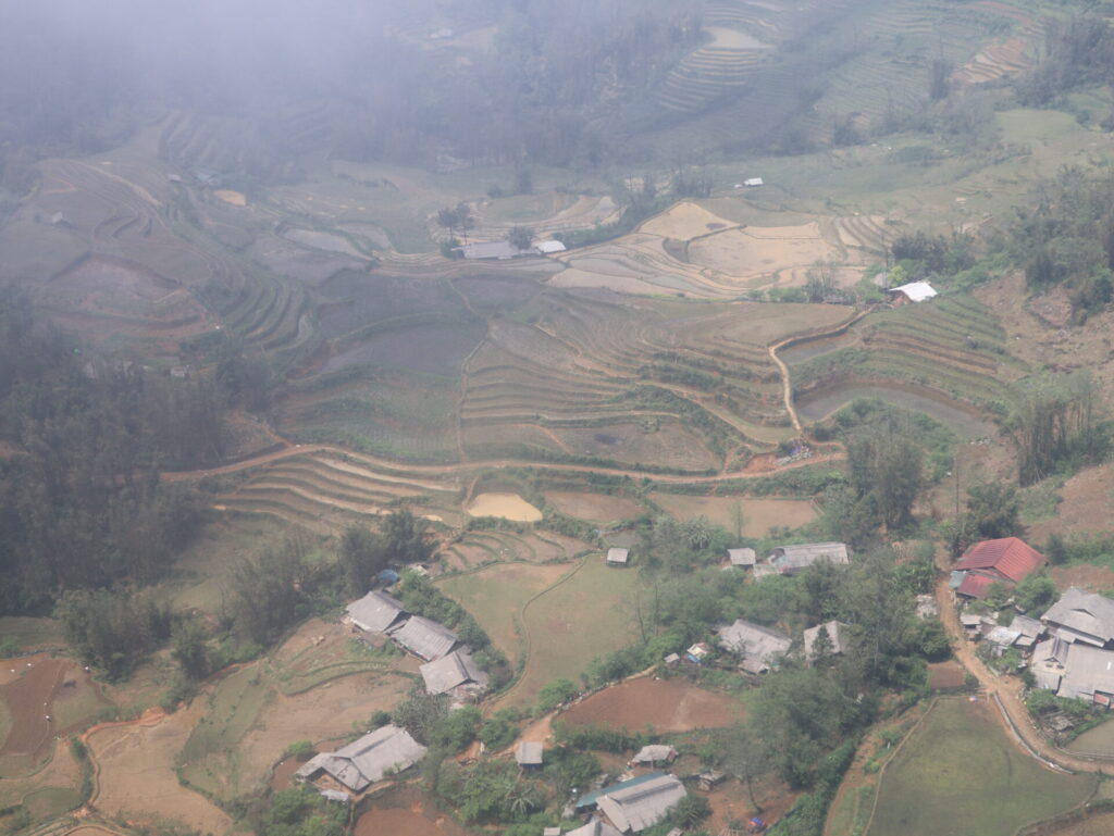 Von Sapa aus geht es mit dem Funicular, dem Muong Hoa Bahn, zur Talstation der Seilbahn. Natürlich wurde hier ein wunderschöner Park angelegt. Wir sehen leider nicht viel, da wir in den Wolken stecken. Wir müssen um den Park laufen, da wir keine Wow-Karte (VIP-Karte) haben 🙈. Wir kommen durch ein neu angelegtes Mai-Dorf. Dies ist ebenfalls einer der 54 ethischen Minderheiten in Vietnam.