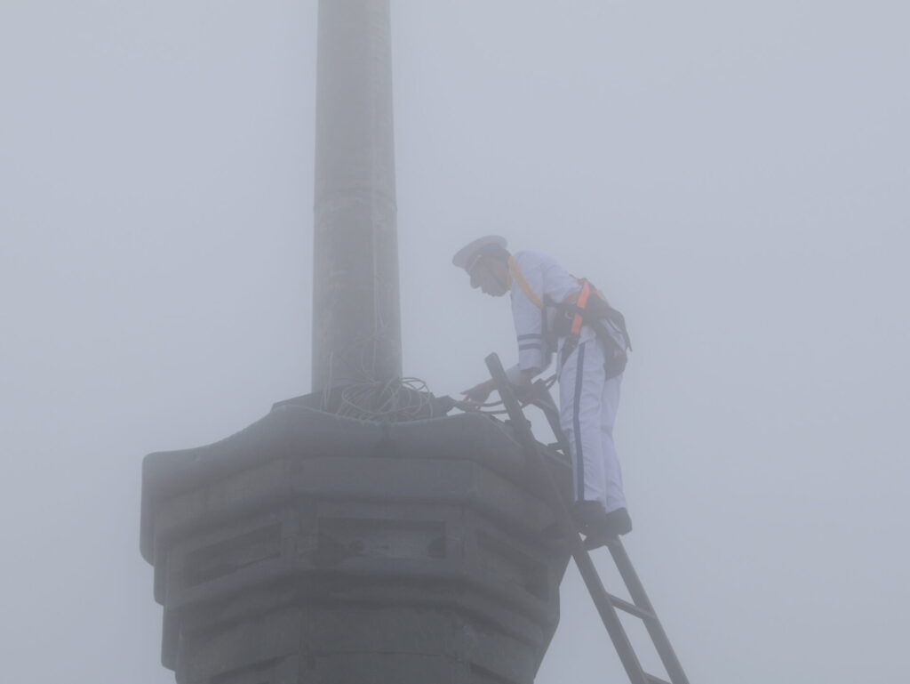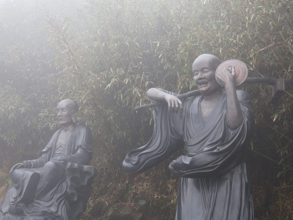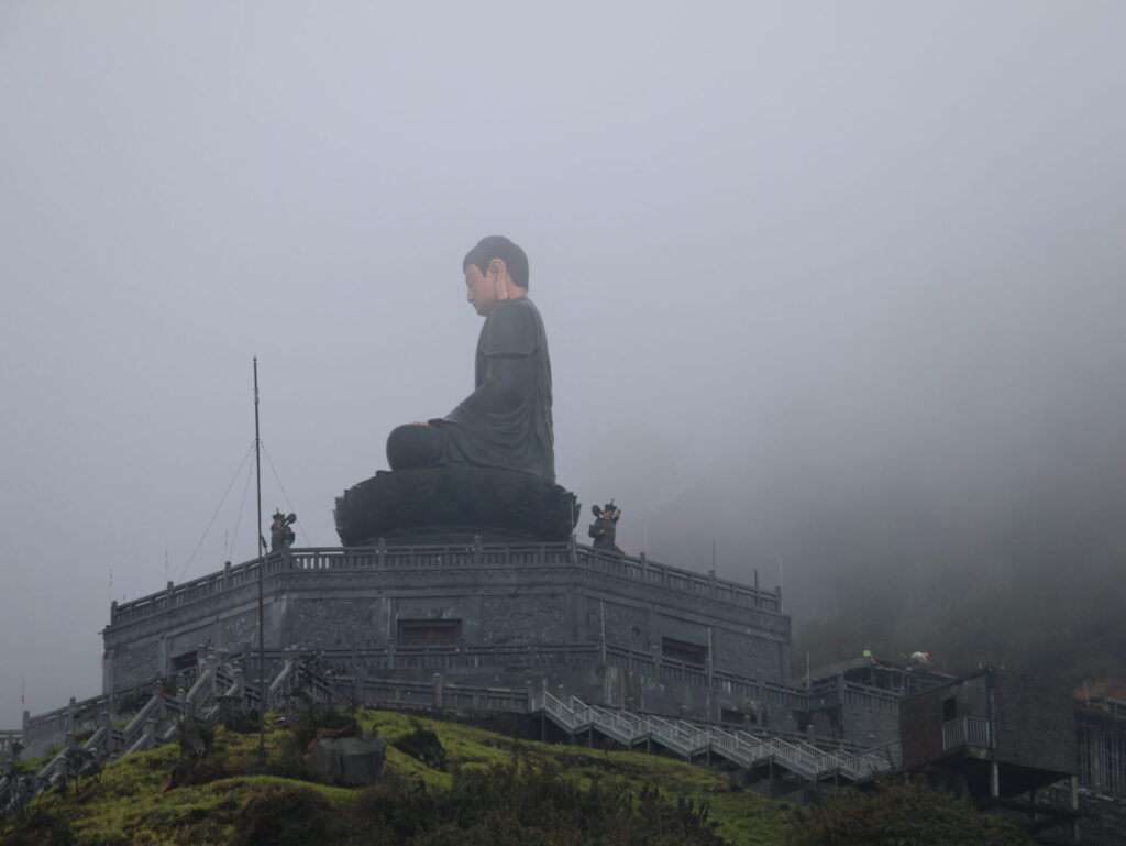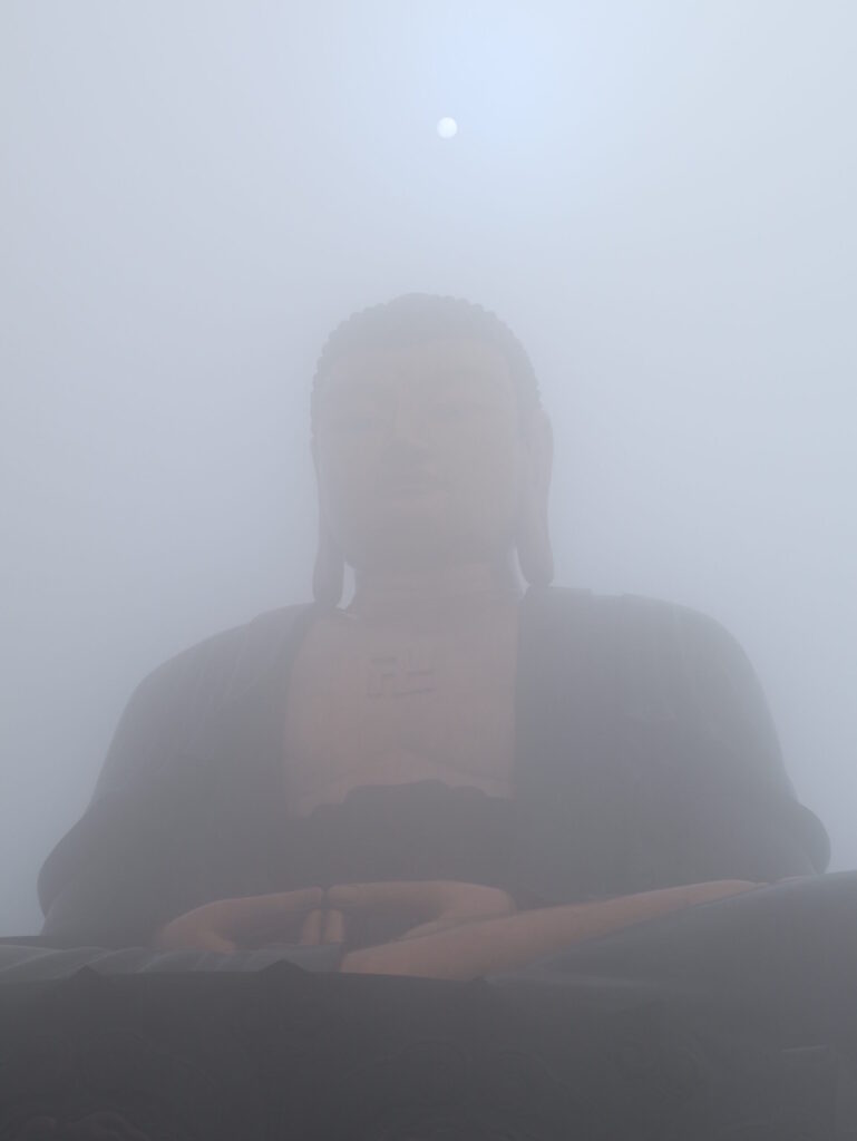 Oben ist alles im Nebel. Die 20 Meter hohen Buddha, der Tempel und die national Flagge. Hin und wieder verschwinden die Wolken und kommt die Sonne kurz durch. Das ist so schön.