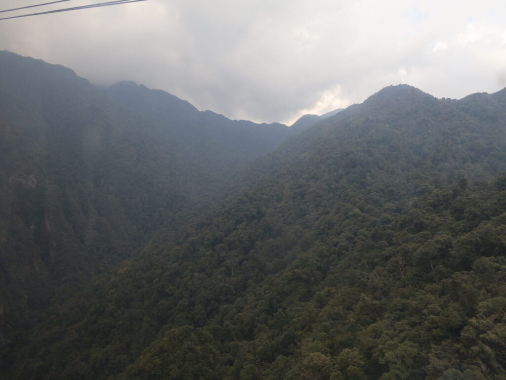 Boven op de berg, we zitten al op ongeveer 2900 meter, moeten we de laatste meters te voet afleggen. Er is weliswaar een kabelbaan, maar de rij is erg lang.