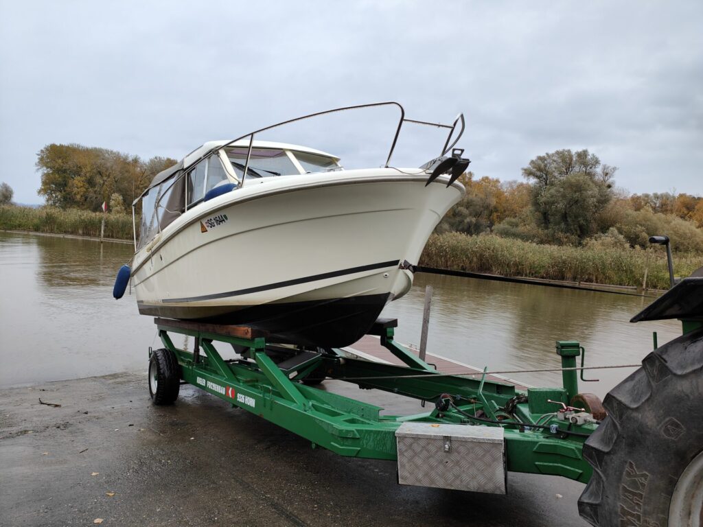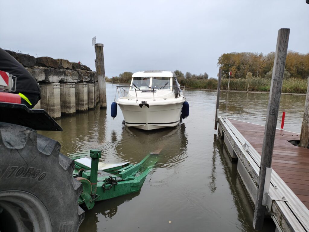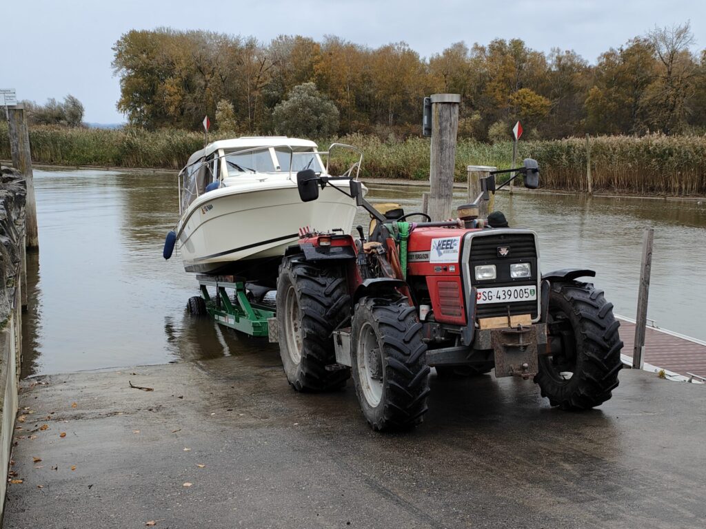 Um ca. 08.00 Uhr ging es los zur Auswasserrampe. Wir waren etwas zu früh, aber als wir anlegten, hörten wir bereits den Traktor von Sepp in der Ferne. So mussten wir Merlinda nicht mehr festmachen. Es war Sepp, der mit dem Anhänger kam. Wie jedes Jahr ging das Auswassern ganz flott.