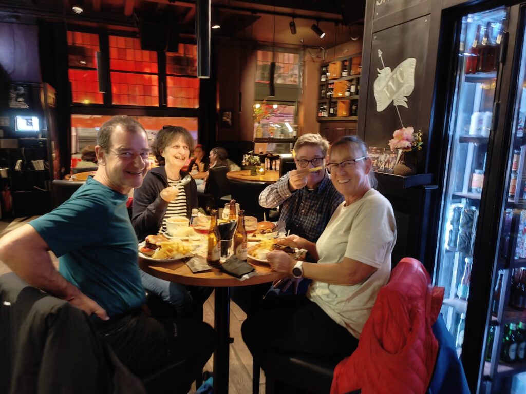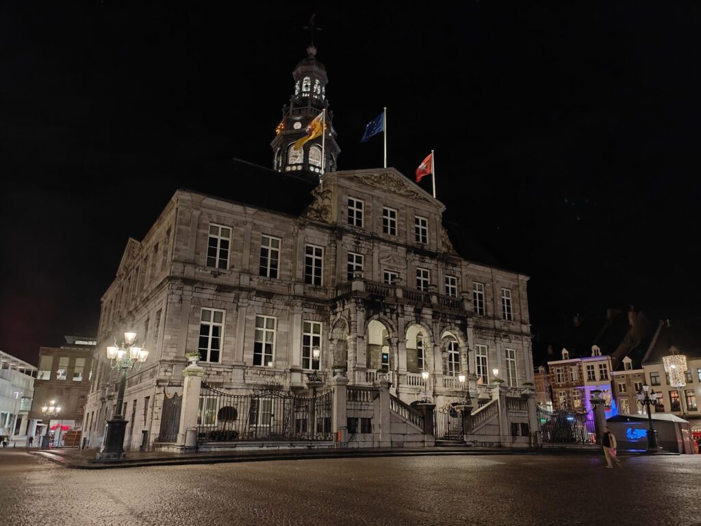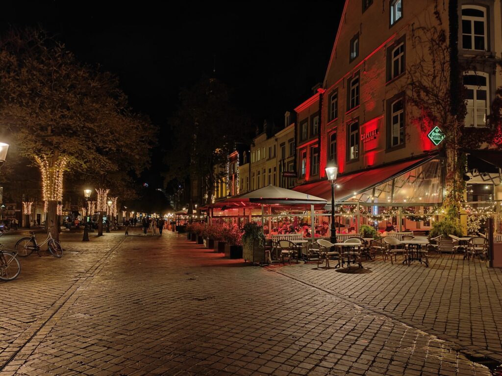 In Maastricht branden de kerstverlichtingen al. Dit zorgt voor een heel andere sfeer dan eind september. De terrassen zijn nog steeds open en worden verwarmd met warmtelampen. Voor ons was het te koud en hebben we binnen een tafel gekregen.