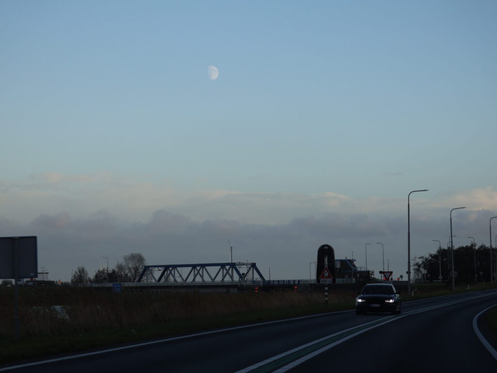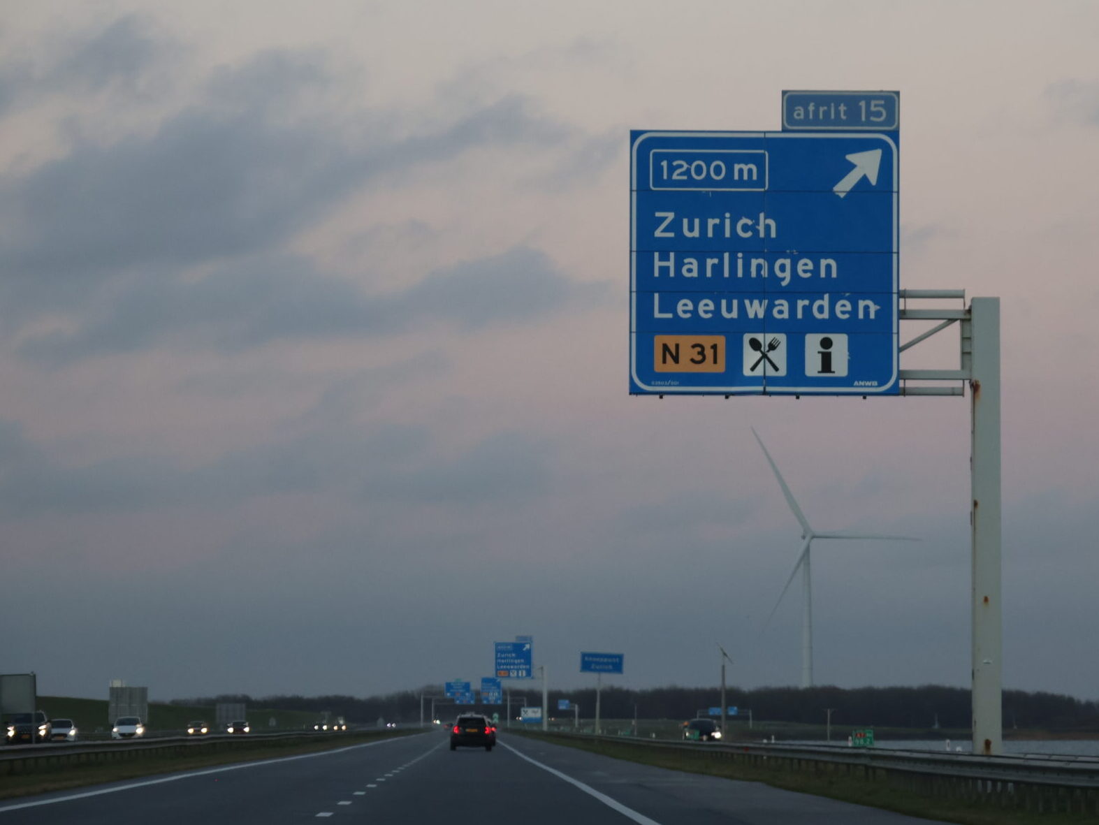 Ik wil niet via de snelweg rijden, maar via het platteland. Het regent de hele tijd en we zijn blij dat we droog en warm in de auto zitten. Na ongeveer anderhalf uur bereiken we Zurich en het begin van de Afsluitdijk.