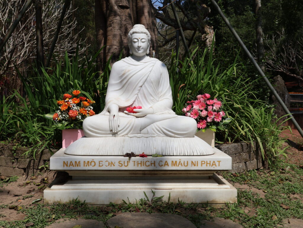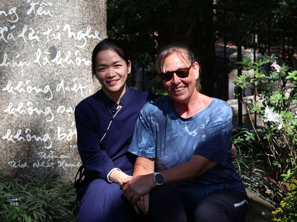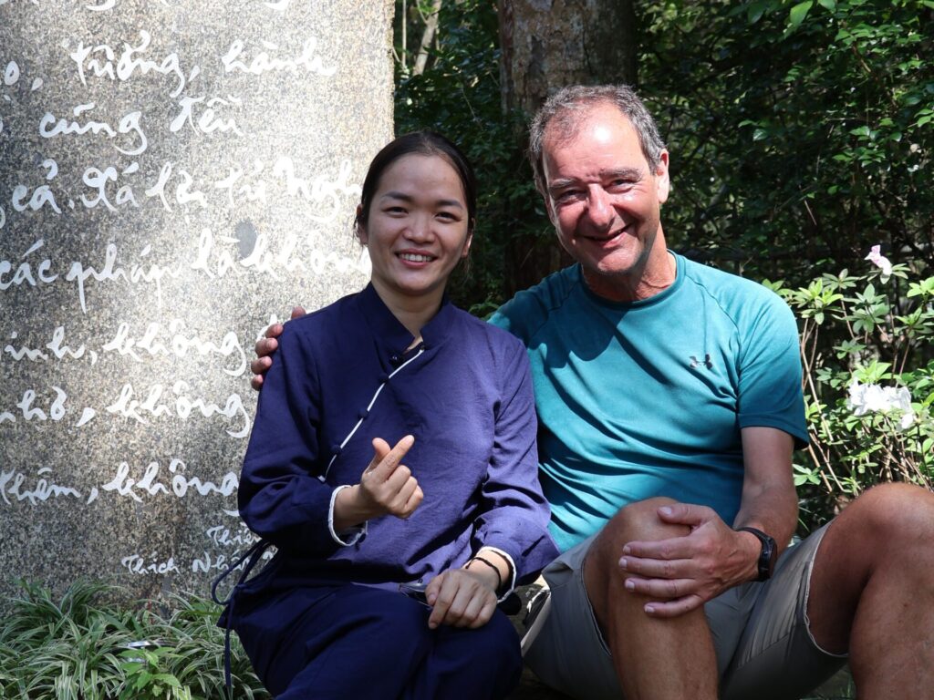 Mensen van over de hele wereld zijn naar deze pagode gekomen om samen te mediteren. Het was ons al opgevallen dat er heel veel mensen waren. De jonge vrouw heet Thoa en komt uit Da Nang. Ze heeft de tijd genomen om ons rond te leiden over het terrein.