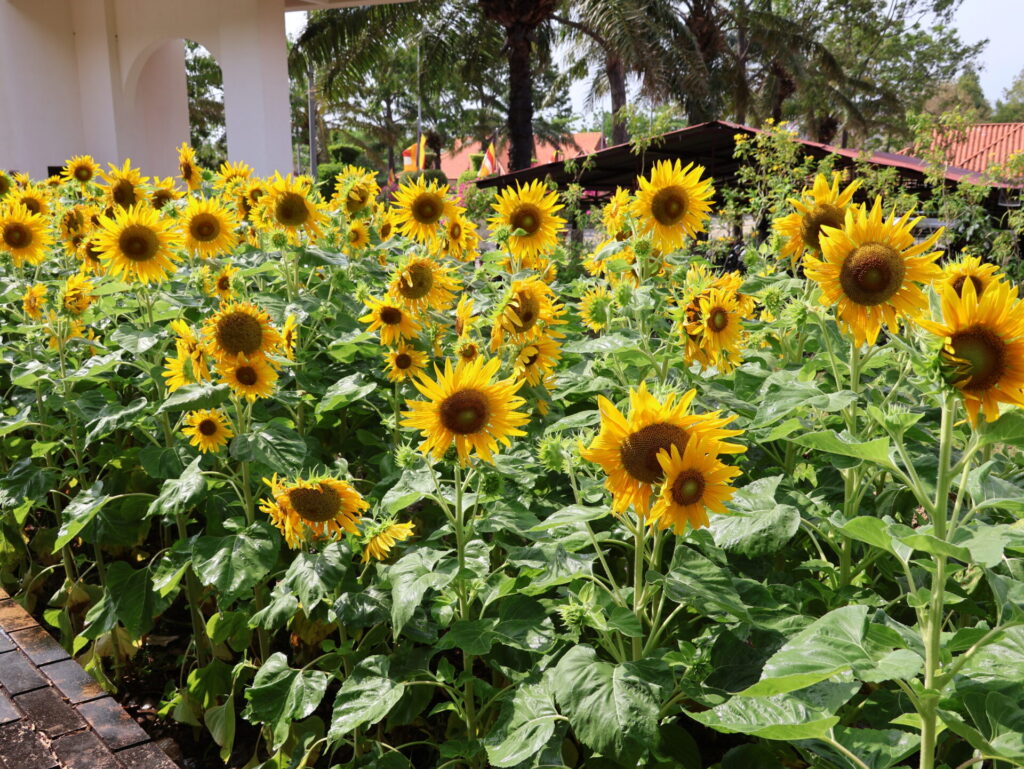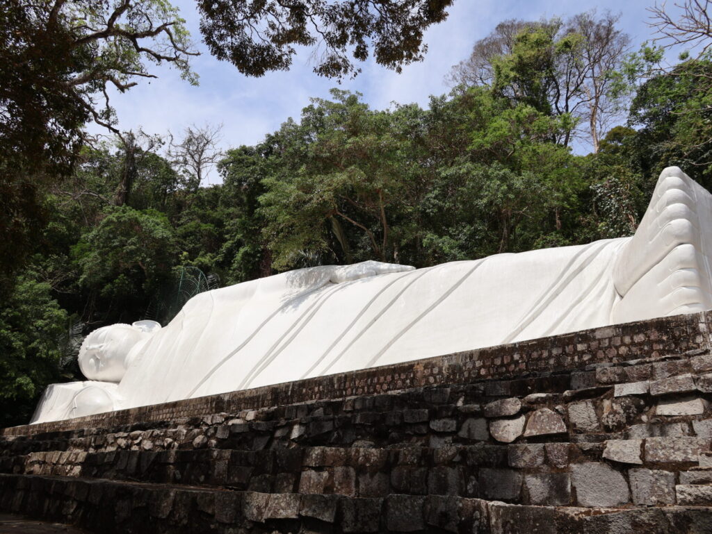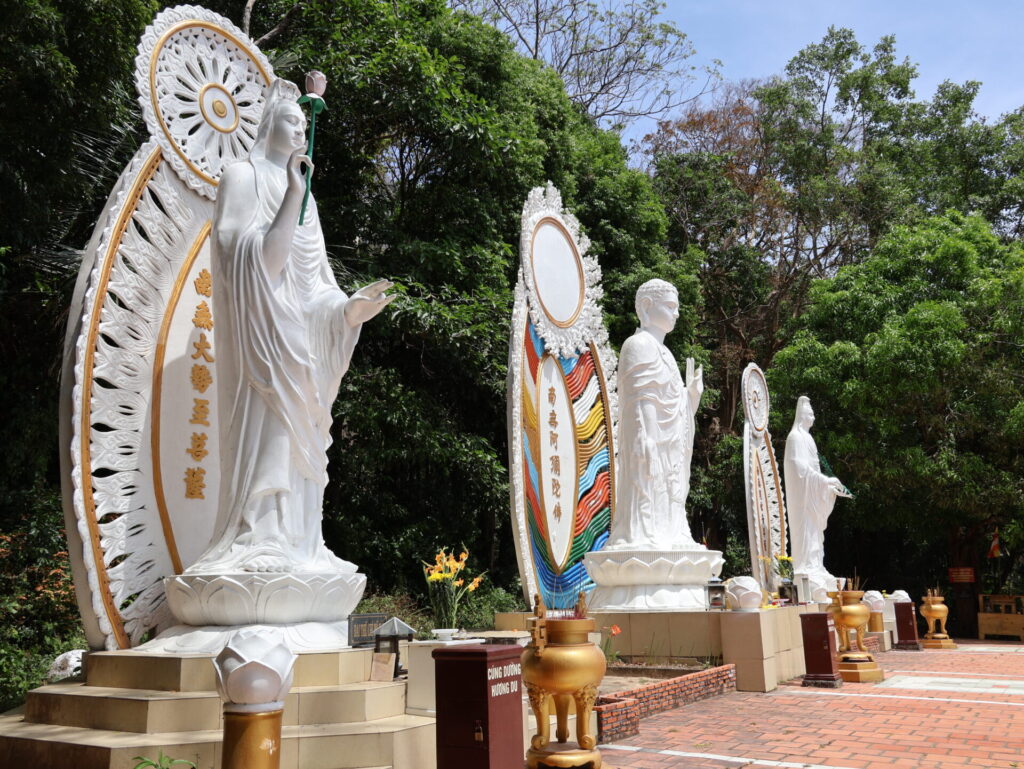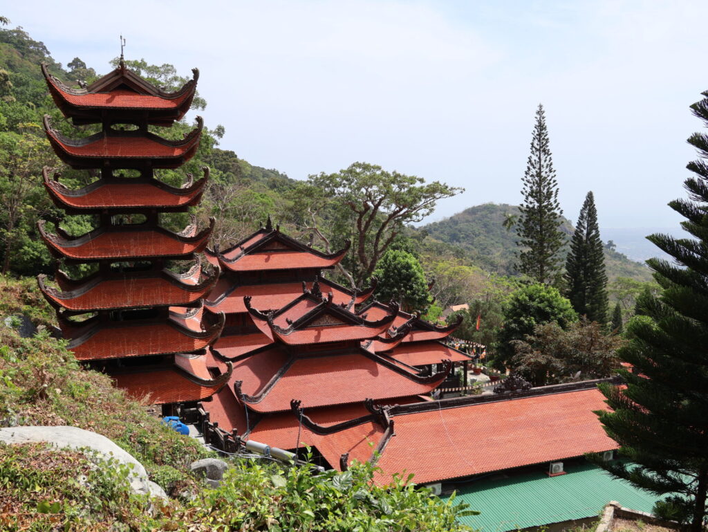 Als we aankomen, hebben we eerst iets te drinken nodig om even bij te komen van de rit. Daarna gaan we met de kabelbaan de bergen in. Nou ja, bergen… 695 meter hoog. Daarboven staat de boeddhistische pagode Tà Cú en een slapende Boeddha van 49 meter lang en 11 meter hoog.