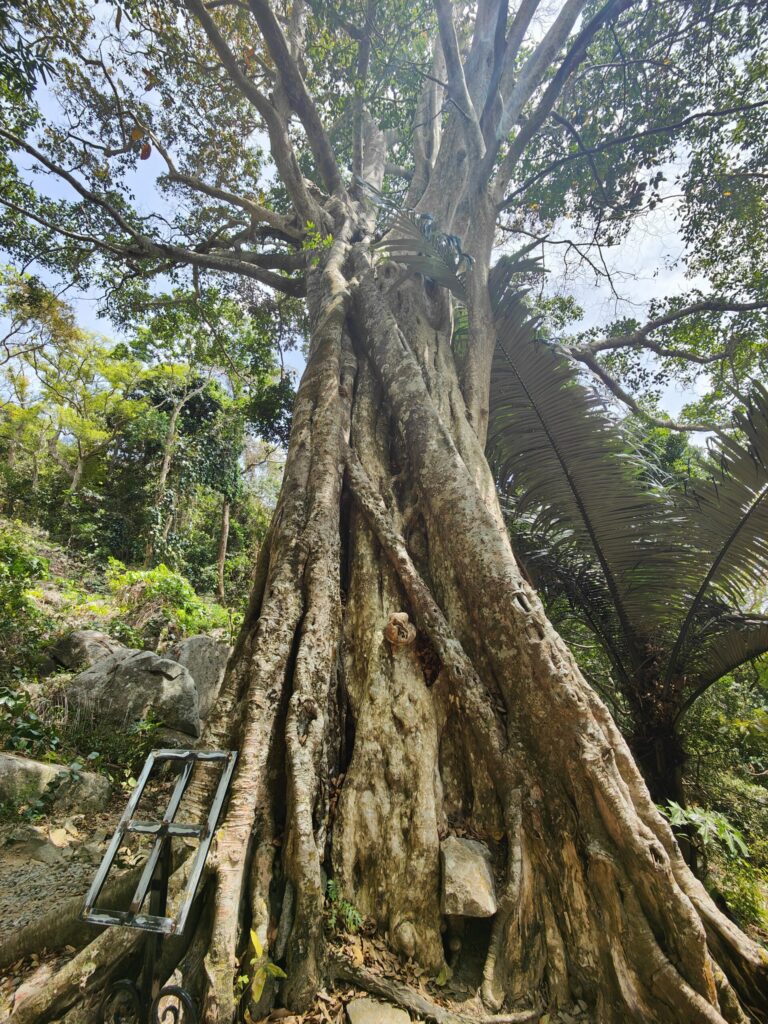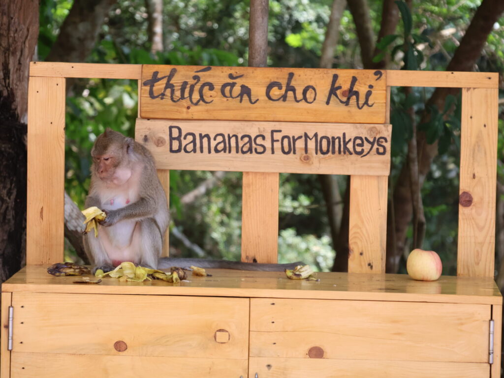 Onderweg daarheen, we moeten toch een stukje lopen 🤪, komen we een groep apen tegen. Er staat een speciale tafel voor bananen en elke keer als iemand fruit offert, wordt dit door de apen gestolen. Het is grappig om te zien.
