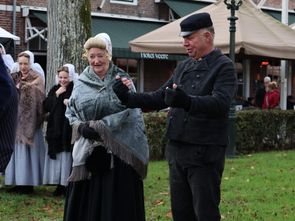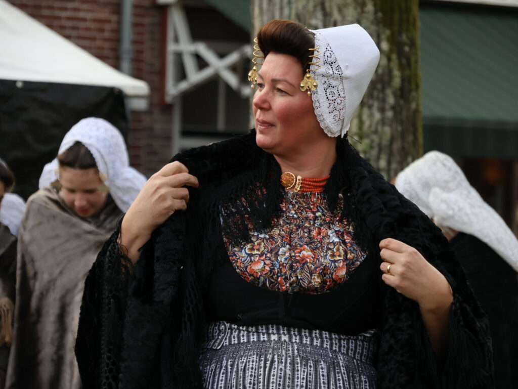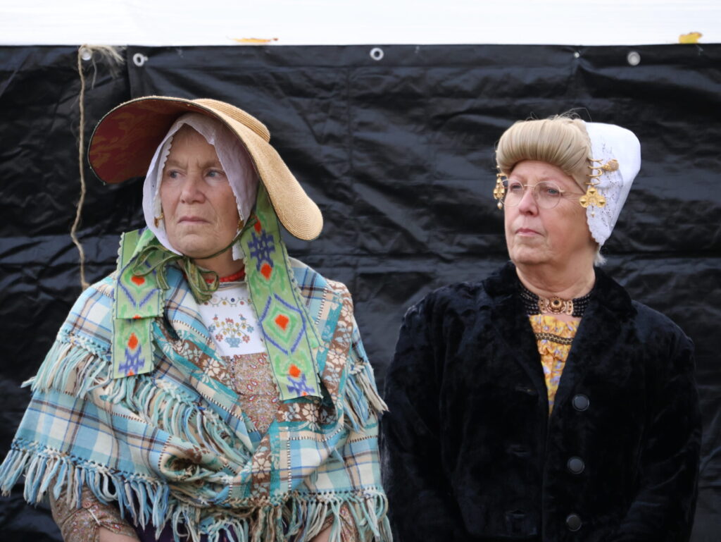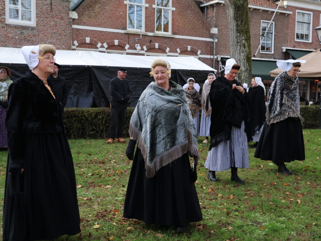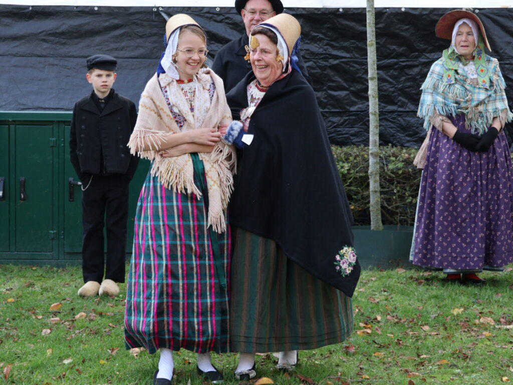 De klederdrachtvereniging toont de verschillende klederdrachten uit 1850 en nu. Dat is heel interessant. De mensen in de klederdrachten hebben het koud en wij met hen.