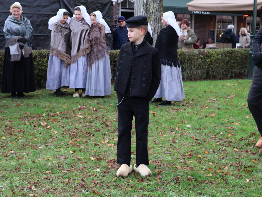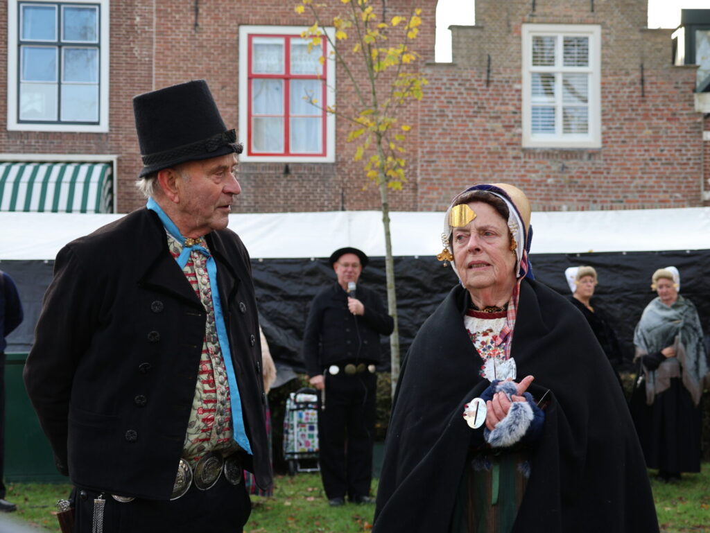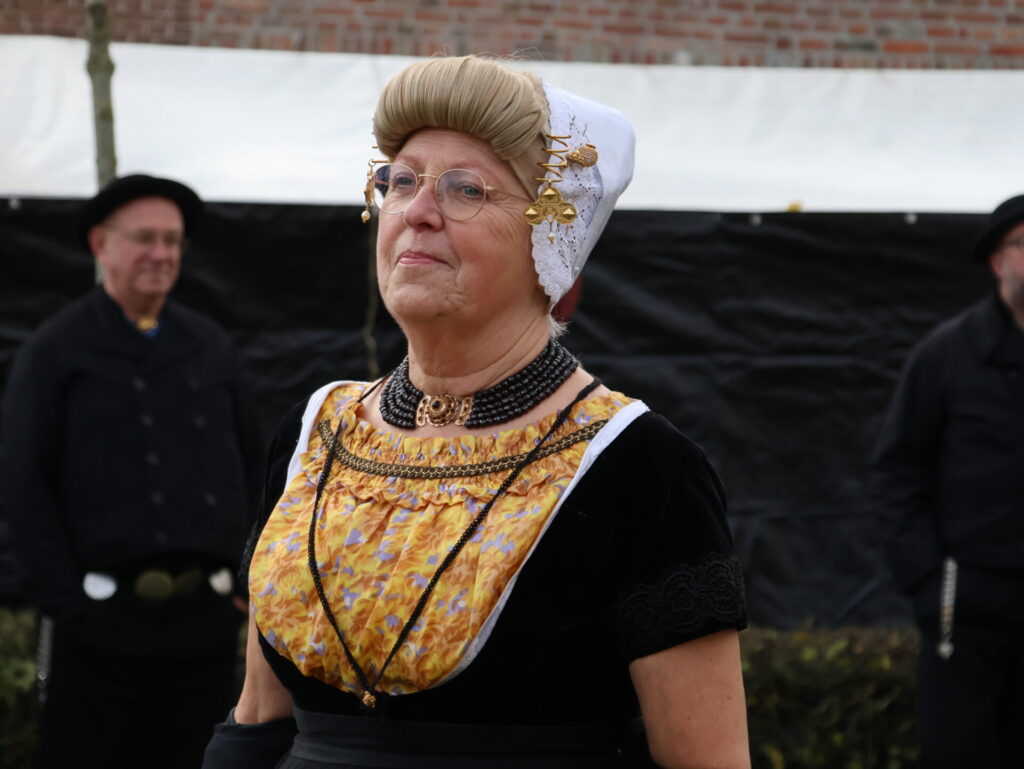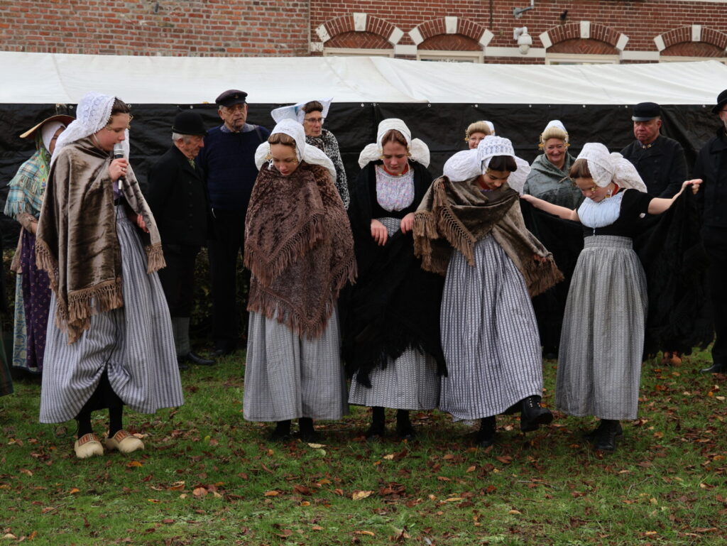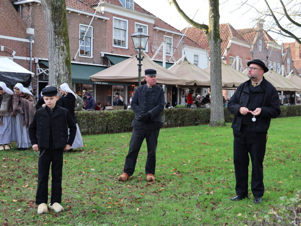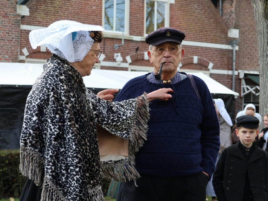 De klederdrachtvereniging toont de verschillende klederdrachten uit 1850 en nu. Dat is heel interessant. De mensen in de klederdrachten hebben het koud en wij met hen.