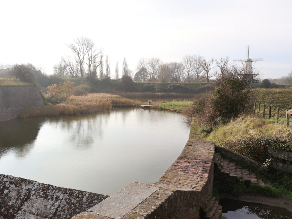 Het bolwerk «Stenen Beer» dateert uit 1811 en maakt deel uit van het fort van Veere. Via een lange gang met schietsleuven komen we aan de andere kant bij het water (het Veerse Meer). Links ligt het Molenbolwerk (om 1600). Rechts het Oranjebolwerk (uit 1584). We wandelen nog een stukje langs het water. Het is heerlijk in de zon.