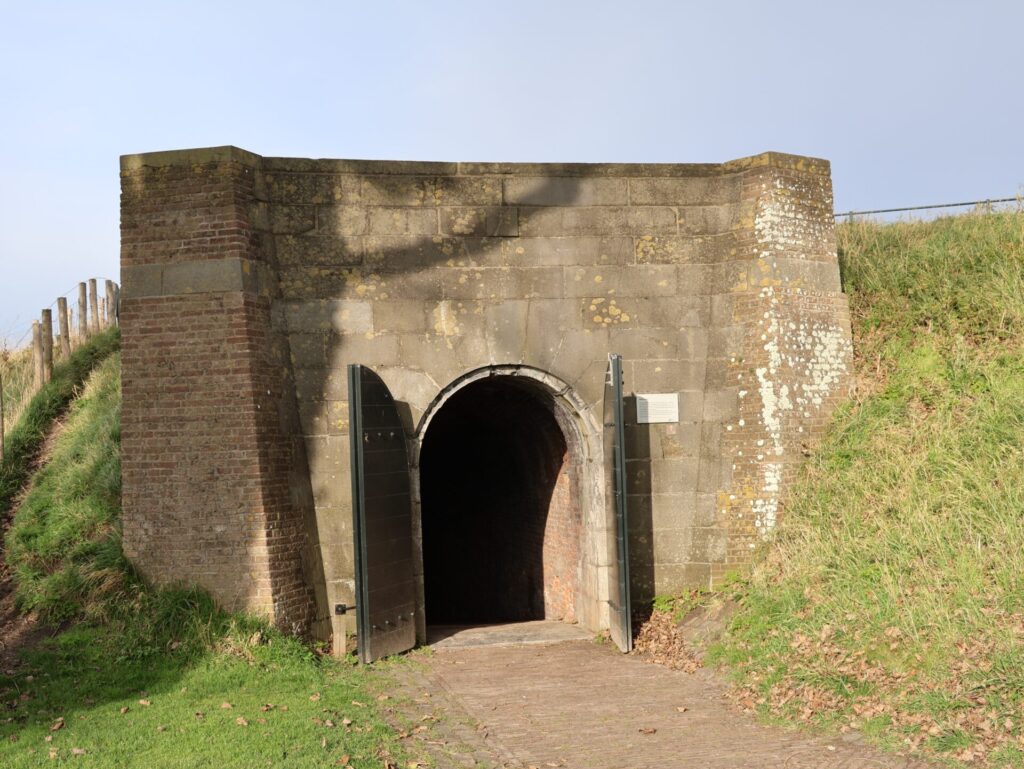 Op de heenweg hebben we meestal wind in de rug en de zon schijnt. Na iets minder dan een uur zijn we er. Als we de fietsen stallen, zien we dat de poort van het bolwerk openstaat. Dus gaan we daar eerst heen.