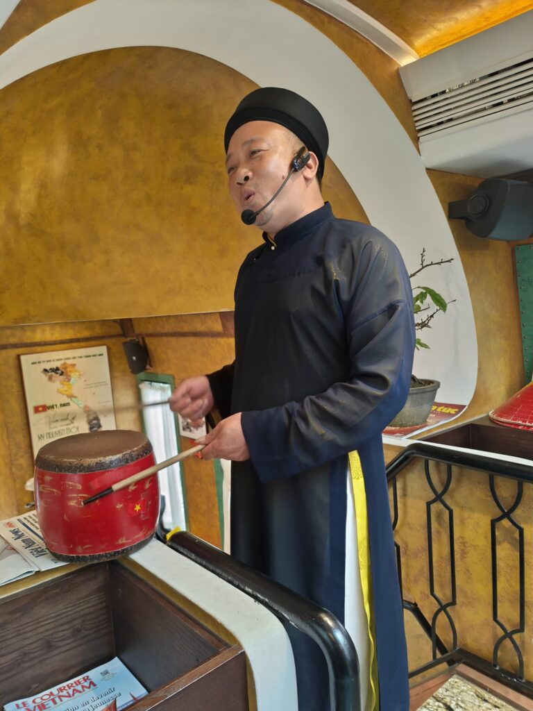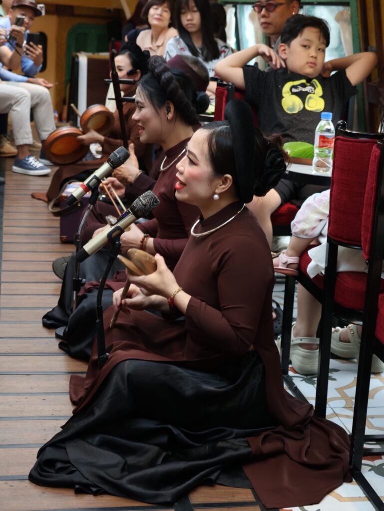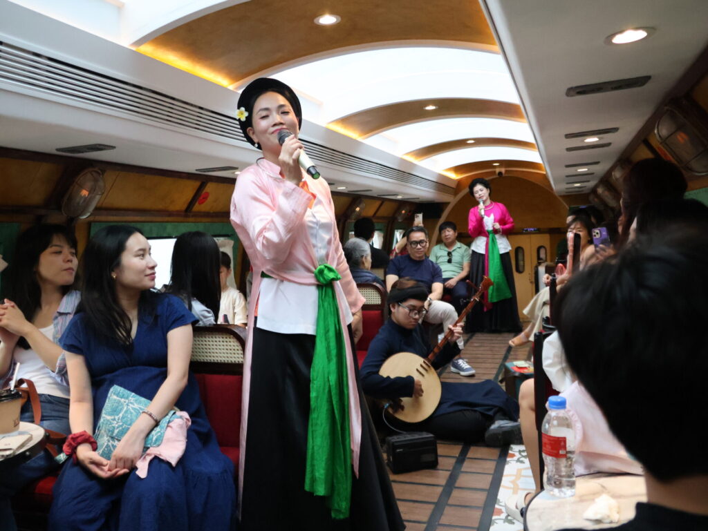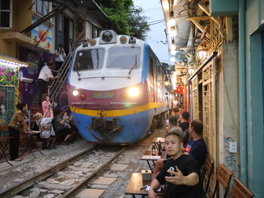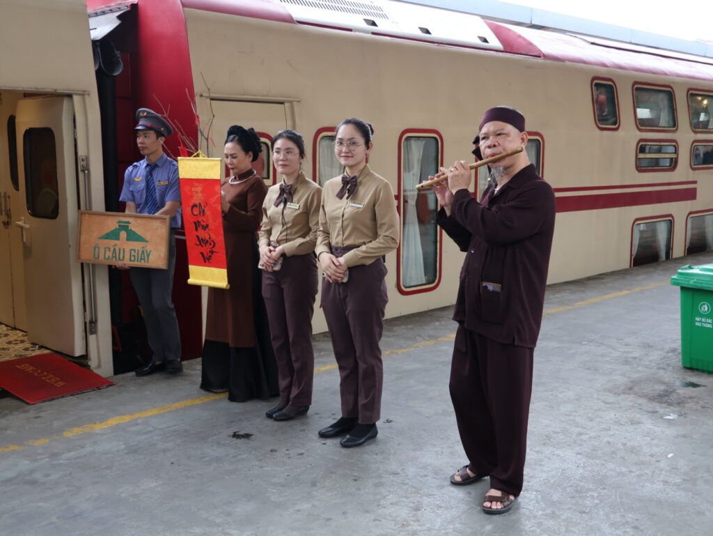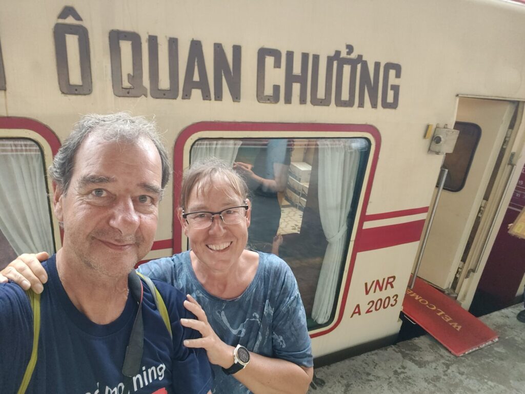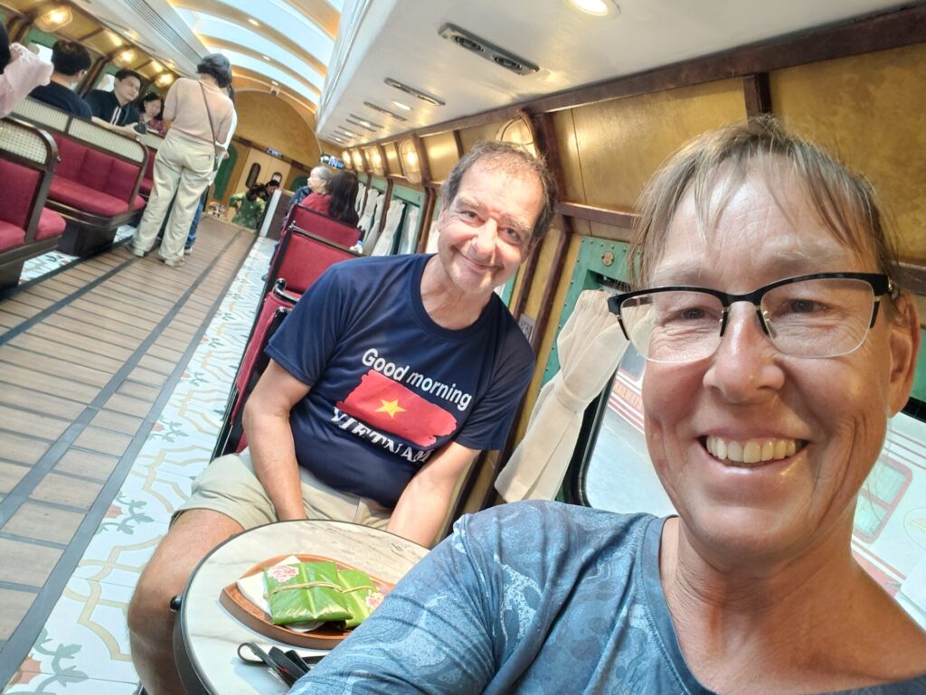 Op het perron werden we verwelkomd door muzikanten en de bemanning. Elke wagon heeft een naam. Wij zitten in wagon Ô QUAN CHƯƠNG. De rit komt langs de Train Street en het station Long Bien, en daarna over de beroemde brug over de Rode Rivier. Hier waren we ongeveer drie maanden geleden al eens. Toen, aan het begin van onze reis door Vietnam.