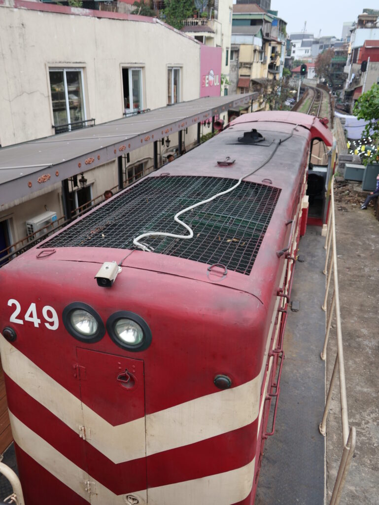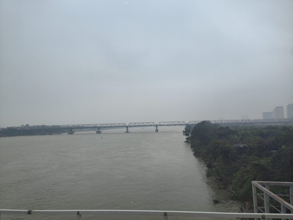 Am Gleis wurden wir von Musiker und der Crew begrüsst. Jeder Waggon hat einen Namen. Wir sind im Waggon Ô QUAN CHƯƠNG. Die Fahrt geht an der Trainstreet und am Bahnhof Long Bien vorbei, danach über die berühmte Brücke über den roten Fluss. Hier waren wir vor etwa drei Monate bereits. Damals am Anfang unserer Vietnam Reise.
