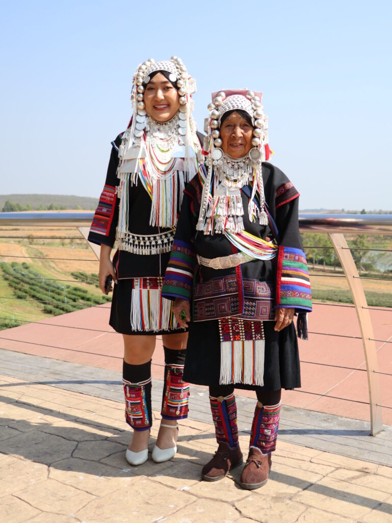 We ontmoetten daar drie vrouwen in prachtige klederdracht. Een van de vrouwen sprak goed Engels en vertelde dat ze tot het Akha-bergvolk behoren. Dit volk komt oorspronkelijk uit de Tibetaanse hooglanden. De klederdracht wordt bij speciale gelegenheden gedragen. Elke vrouw heeft haar eigen patroon. Ze waren ook allemaal verschillend. Bijzonder is de zilveren hoofdtooi. Die is behoorlijk zwaar. We mochten twee vrouwen fotograferen.