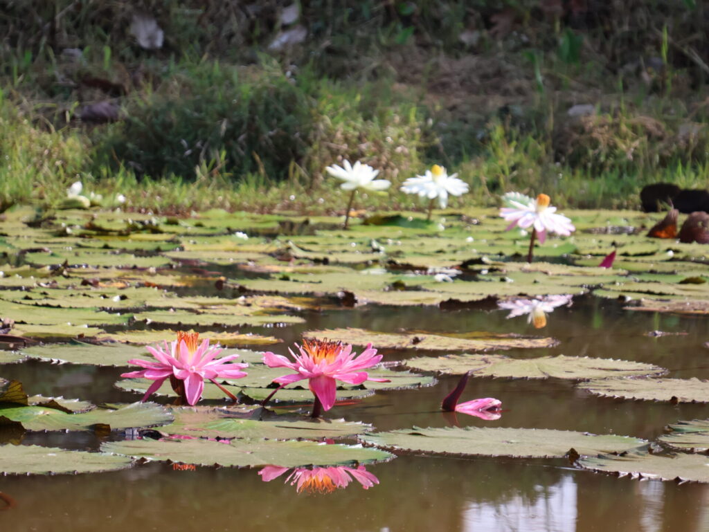 Theeplantages zo ver het oog reikt. Op de achtergrond de bergen. Puur genot. De lotusbloemen bloeien hier al in volle pracht. Het is de eerste keer dat ik lotusbloemen in de vrije natuur zie. In Ninh Bình waren ze nog in winterslaap. We hebben veel vogels gezien. Onder andere een ijsvogel. Wat een geluk.