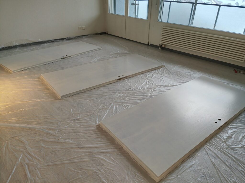 Voordat we vertrekken, schilderen we de deuren voor de tweede keer. Het resultaat is aanzienlijk beter dan na de eerste keer. We hebben weer meer vertrouwen dat het mooi wordt.