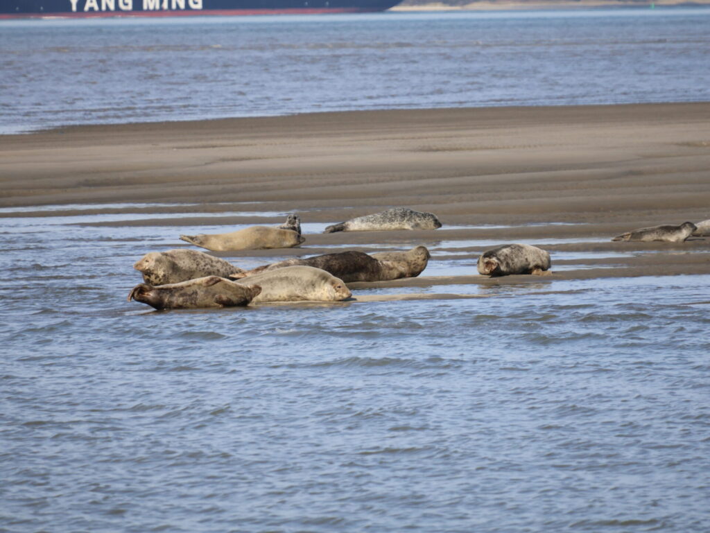 Los ging es von Hafen einmal quer über die Westerschelde zu den Sandbänken. Da es um die Mittagszeit Niedrigwasser war, sind diese noch trocken und ruhen viele Seehunden sich dort aus. Auch sie geniessen die Sonne.